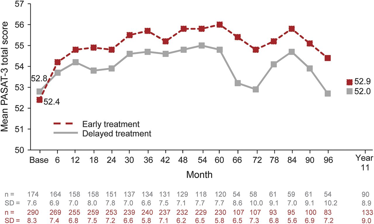 在整个研究期间,平均PASAT-3总分——初高于延期治疗组(p= 0.0070)。PASAT-3 =节奏听觉连环任务3。