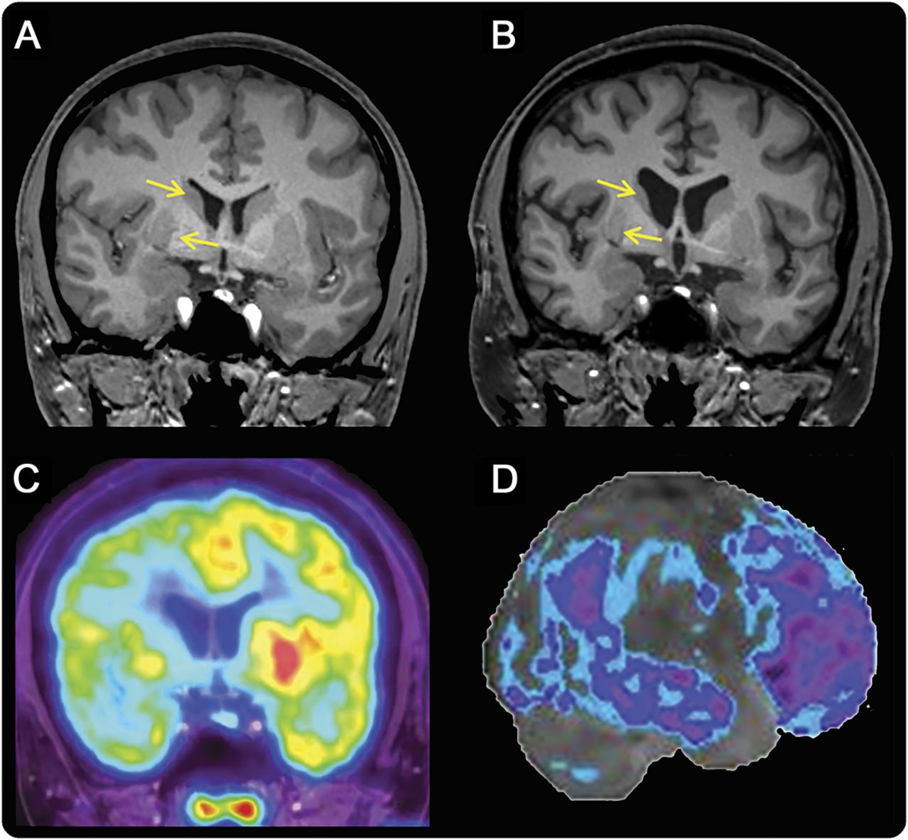 冠状t1加权磁共振成像从2015年2013 (A)和(B)显示进步的脑萎缩,右边比左边,最突出的纹状体(箭头)。从2011年最初的核磁共振正常。(18F] pet显示右半脑代谢减退主要包括纹状体(C)和额叶和颞叶(蓝色区域,D)。