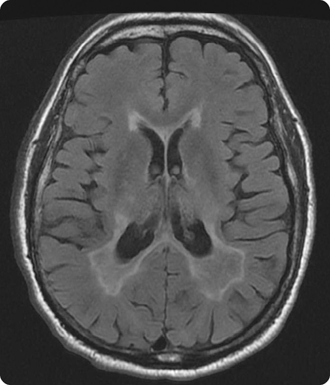 71岁的慢性吸烟者有一个11个月的历史单眼双目椭圆眼球震颤和振动幻视紧随其后(视频首页Neurology.org)。大脑MRI显示广泛的室周的T2信号变化(图)和脑脊液蛋白升高到102 mg / dL。脑脊液和血清中多种面板显示血清浓度升高anti-P / q型电压门控钙通道(VGCC)和anti-neuronal-type电压门控钾通道抗体。后一个潜在的恶性肿瘤未找到一个广泛的调查。病人与卡马西平治疗有症状的控制,其次是第四大剂量甲强龙,导致温和改善。Anti-VGCC抗体已经涉及多种的眼球震颤和小细胞肺癌是最常见的恶性肿瘤有关。1,2