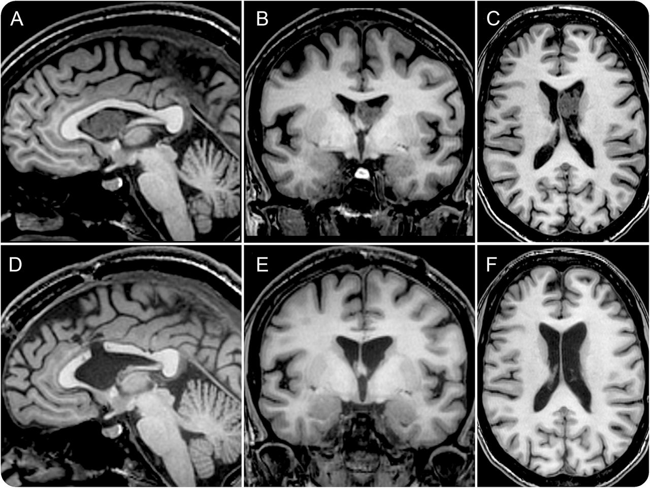 MRI显示脑室质量(A)和孟氏孔部分梗阻(B)导致轻微的左侧侧脑室扩大(C),咳嗽转移肿瘤,完全自由流动的阻塞脑脊液孟氏孔,造成间歇性脑积水。孟氏孔阻塞手术切除后消失subependymoma (D-F)。