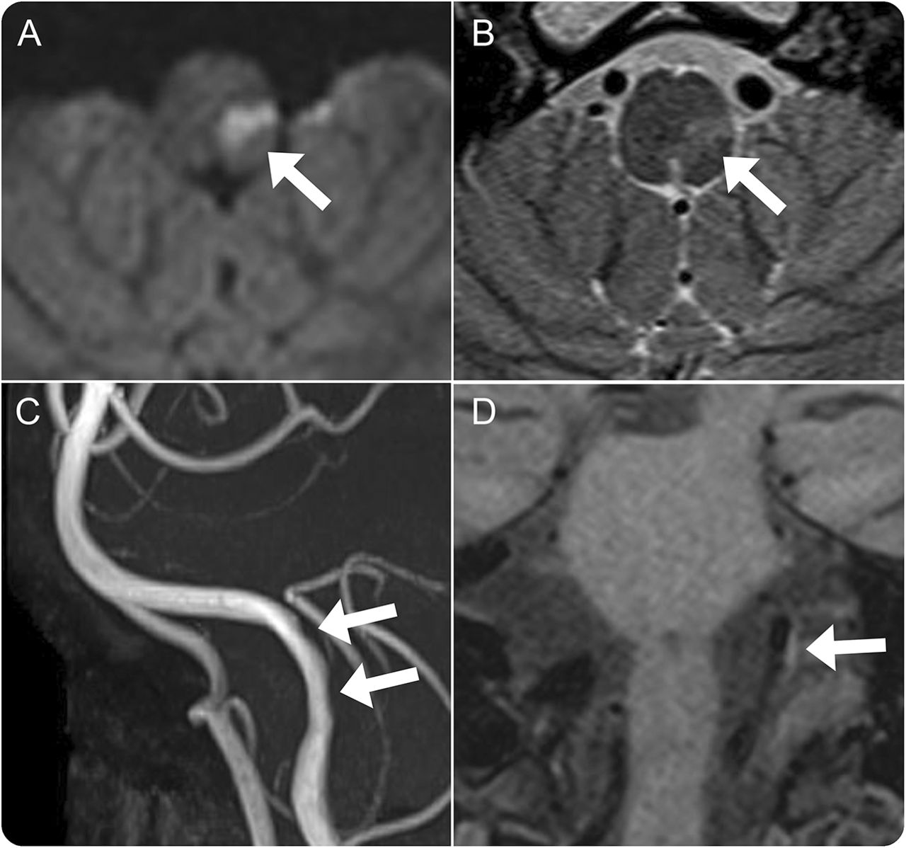 Diffusion-weighted和t2加权图像显示急性梗死的左边侧髓质(A, B)。磁共振血管造影术和黑血MRI显示左椎动脉的解剖(C, D)。