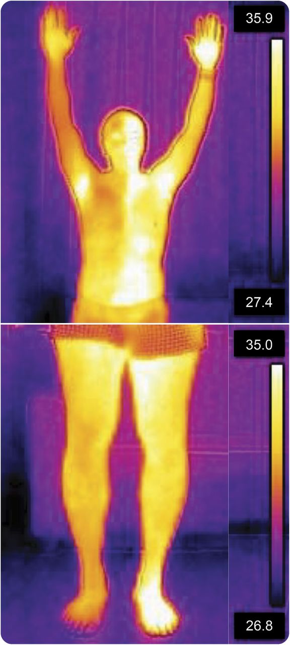 一名51岁男子承认与左外侧髓梗死由于椎动脉解剖(图1)。神经系统检查发现眼球震颤,分离的感觉障碍,没有证据表明瘫痪。减数分裂和上睑下垂观察身体的同侧的一侧,但hypohidrosis并不明显。温度记录揭示了两国在体温的差异,如果病人(从中间一分为二图2)。之间的不对称皮肤温度会发生•瓦伦堡综合症患者与霍纳综合征由于干扰造成的下行交感神经束侧hypohidrosis和增加皮肤的血液流动。1