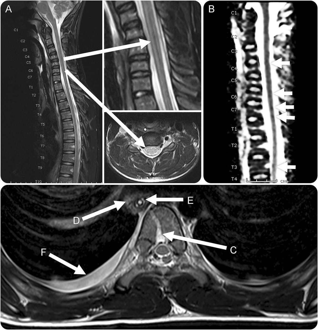 微妙的证据T2 hyperintensity整个脊髓(A) (B)表观扩散系数变化二次静脉充血的基部的脊椎神经丛(C)纵隔炎有关。(D)可以通过增厚墙食管(E) intra-luminal原位胃管,peri-oesophageal炎症和胸膜腔积液(F)。