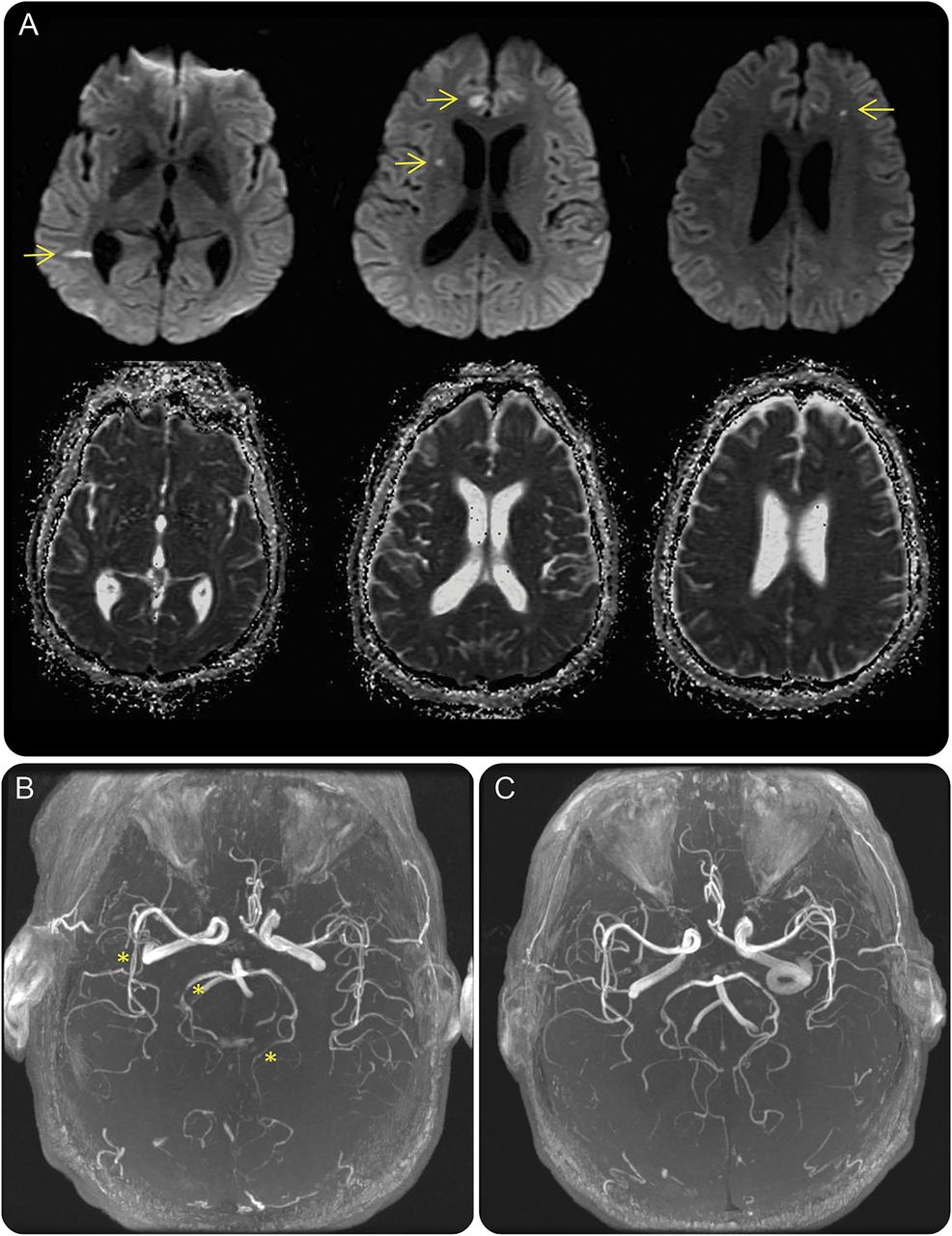 (A)轴向diffusion-weighted(上面一行)头部MRI显示限制扩散在多个血管领土(箭头),包括两国前脑动脉的分布,对大脑中动脉和大脑后动脉。领域的扩散限制显示相应hypointensity表观扩散系数成像(底下一行),与急性缺血性梗塞一致。(B)头部MRA显示两国后腔的不规则性脑动脉和右大脑中动脉的分支(星号),符合血管炎。(C)重复10天的抗真菌治疗后头部MRA显示间隔解决以往可视化颅内血管的违规行为。