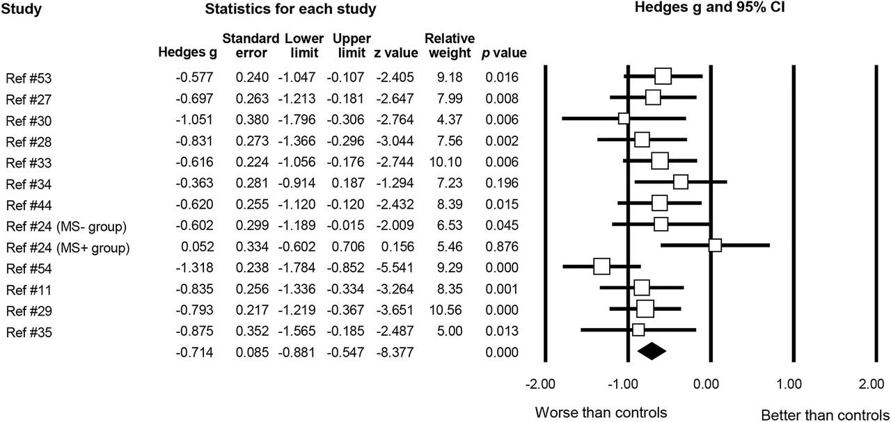 尺度效应、样本大小和整体的异质性统计数据和特定于任务的汤姆的分数表2。汤姆任务的整体性能显著恶化在MS组相对于对照组(图2)。没有检查变量的多元回归分析预测汤姆(所有任务的性能p> 0.13)(表e 1和图e 1首页Neurology.org)。有一些统计学异质性的证据在整个汤姆效应大小。Egger回归测试显示没有证据发表偏倚的整体汤姆(b= 1.324,= 2.07,p= 0.27)。万无一失的N是291,这表明需要有额外的291个空研究为了联合2-tailed吗p值超过0.05。敏感性分析包括唯一的一项研究检查pediatric-onset MS27没有改变原来的效果。