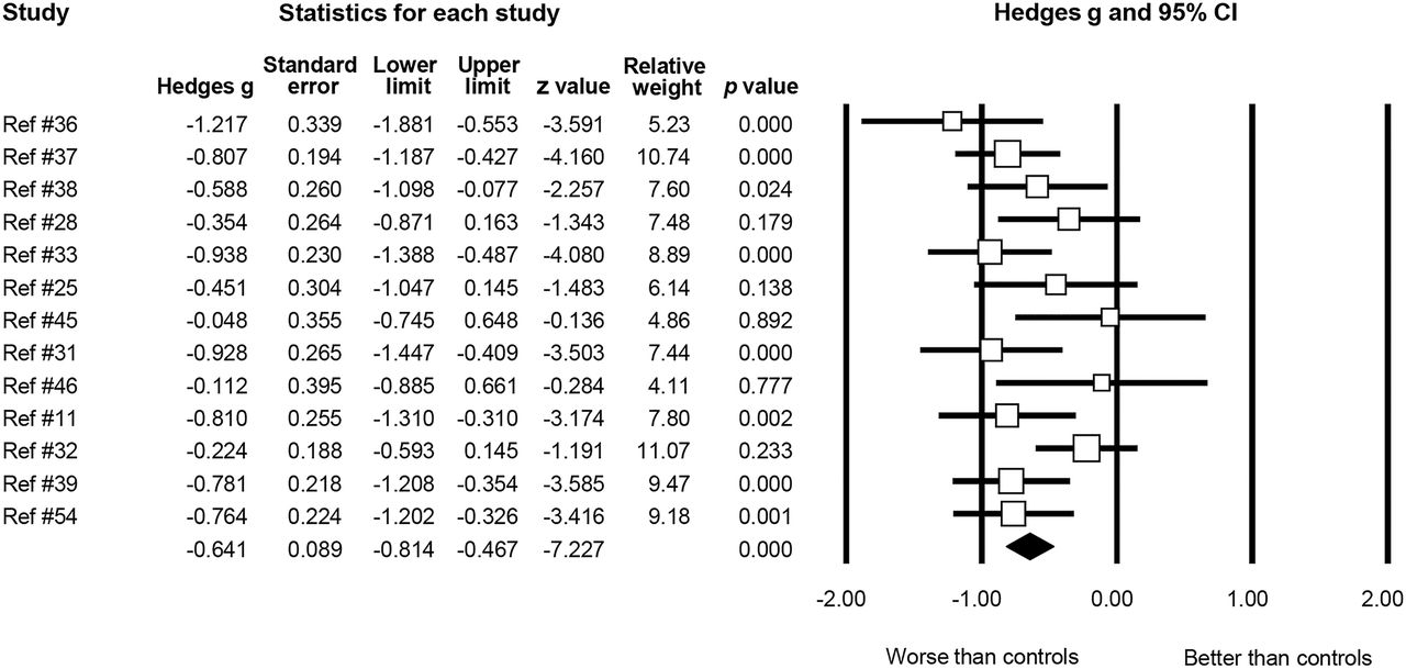 由于临床和人口变化在社会认知评估,研究样本和随机模型应用。这提供了更为保守的估计占观测到的异质性,并且是一个更好的表现比固定效应模型的方法。20.,21异质性量化使用我2和H2统计和CIs。22发表偏倚是调查使用漏斗图,Egger测试,罗森塔尔自动防故障装置数量的尺度效应,生成至少10研究。万无一失的数量是指的数量研究的效应值为零,必须使p值的平均效应值无意义的(例如,p> 0.05)。