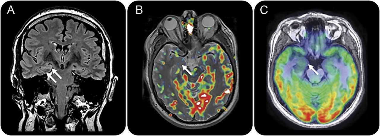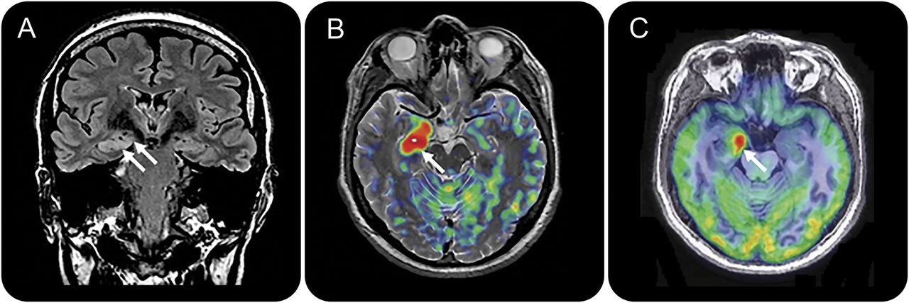 在疾病的急性期,日冕fluid-attenuated反转恢复序列(一个)显示hyperintensity正确的海马和杏仁核(箭头),而动脉自旋标记(B)和18F-FDG-PET (C)描述标记hyperperfusion /代谢亢进限制只有这两个结构(箭头),被高度重复发作引起的。