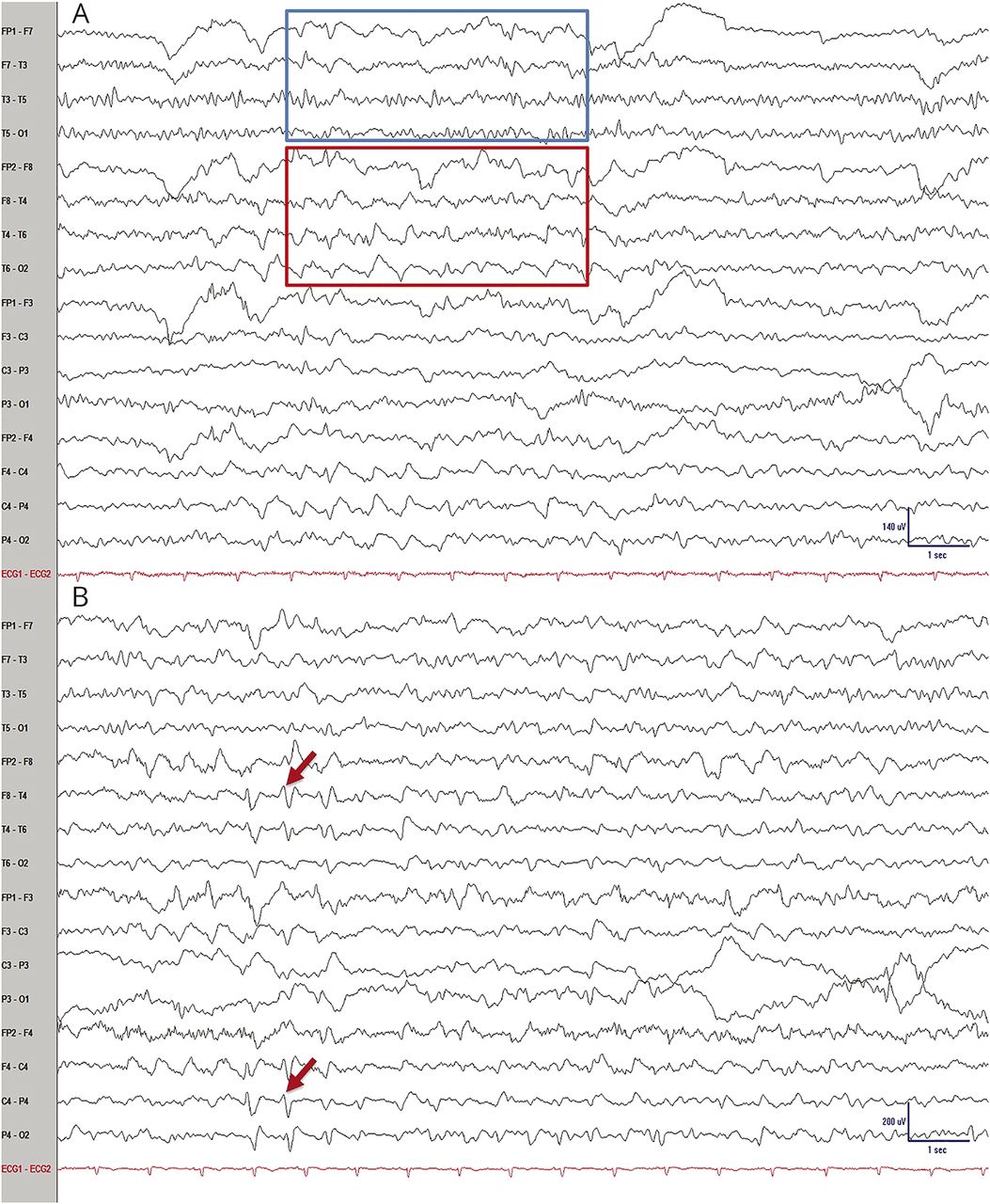 代表时代的脑电图显示(A)后左边的阿尔法节律vs theta-delta右半球和(B)周期性放缓边音的排放在右半球三相的形态。