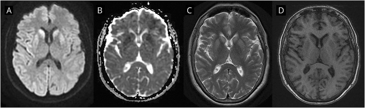 一个62岁的女人,以前健康了3周的进步短期记忆丧失,计算障碍,书写困难、食欲丧失、和频繁的情景左臂矛盾的姿态和眉高程。在考试,她也有手指失认症,构音障碍,agraphesthesia,双边实体感觉缺失,肌阵挛,观念运动的失用症(左更糟),和wide-based步态。脑电图显示放缓和周期性的单侧性的排放在右半球三相的形态,较少涉及到左边,反映临床不对称(图1)。1大脑MRI显示扩散限制与皮质的双边基底神经节的过程更加突出右边涉及多个脑回,符合克雅二氏症(图2)。2
