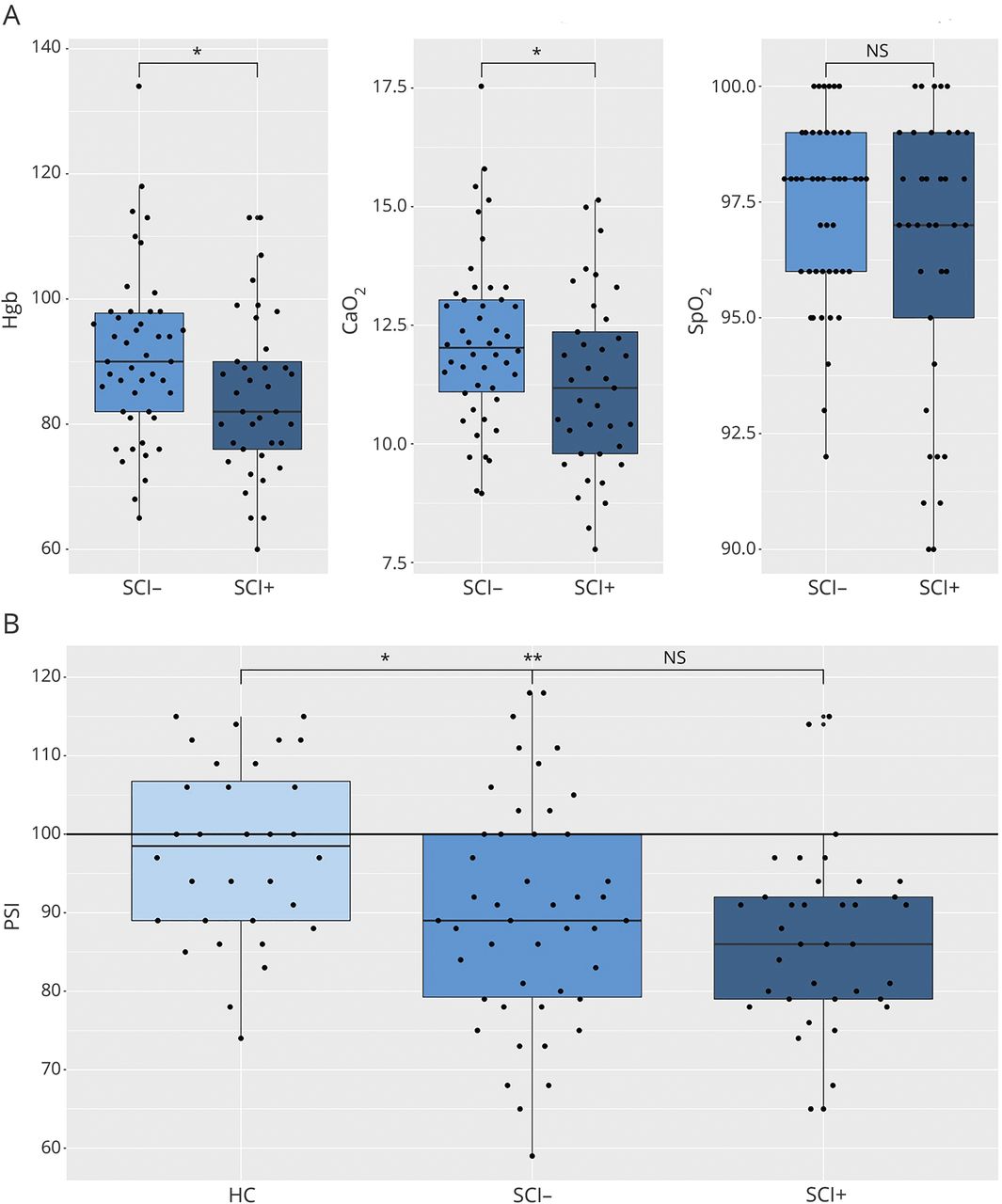 没有年龄或性别差异团体(表1)。83名患者(82镰状细胞血红蛋白,血红蛋白S /β0地中海贫血),37(45%)没有发现神经迹象SCI (SCI +)。病变在8例右侧,左侧在6日,两国在23个。13名患者病变在多个地区;35有额叶病灶,顶叶病变12例、2颞病变,和3枕病变。病变最常位于动脉之间的边界区域分布在额叶白质深处。29个病人在羟基脲(16 SCI−), 5是慢性输血(3 SCI−)和9 6个月内经历了输血的评估(6 SCI−)。平均血红蛋白,Spo2,Cao2低于参考规范(表1)。18例(22%,8 SCI−)与Sp不饱o2≤96%。平均血红蛋白和钙o2SCI患者的低,但没有饱和的差异(图1)。这种模式仍然当输血的患者被排除在外。