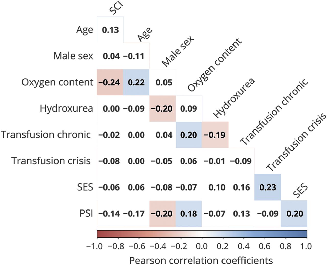 相关图可视化变量包含在探索性回归分析之间的关系。值是零级皮尔森相关系数。阴影区域表示重要的关系。蓝色的颜色代表积极的人际关系,而红颜色代表消极的关系。强度意味着关系的力量。ψ=处理速度指数;SCI =沉默脑梗塞;SES =社会经济地位。