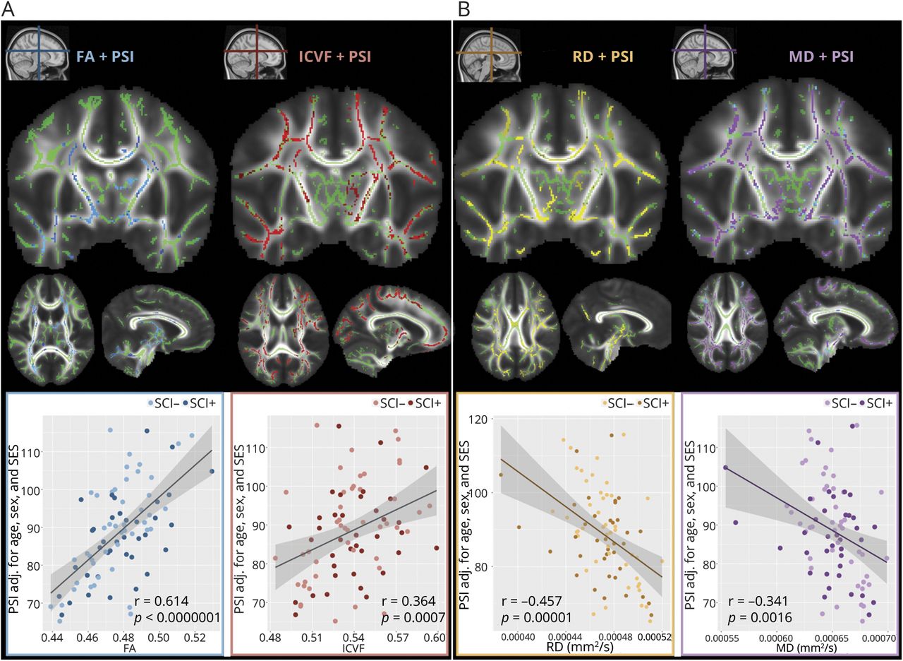 在病人,PSI与FA,医学博士,RD, ICVF (图3)。具体来说,减少PSI与减少FA相关的内囊和胼胝体(r81年= 0.614,p< 0.00001,30492压),减少ICVF覆盖更广泛地区的白质骨架,与集群扩展整个胼胝体,放射冠,和优越的伪劣纵向纤维束(r81年= 0.364,p= 0.0007,70659压)。此外,PSI的减少与增加有关医学博士(r81年=−0.341,p= 0.0016,82663压)和RD,也在广泛的地区,有许多集群位于后方,包括后放射冠和胼胝体压部,分别为(r81年=−0.457,p< 0.00001,67296压)。统计地图可以和交互式地探索neurovault.org/金宝搏188手机appcollections/3510/。这些相关性仍在检查SCI +和SCI−分别组织。没有PSI和轴向扩散系数之间的关系或海外。