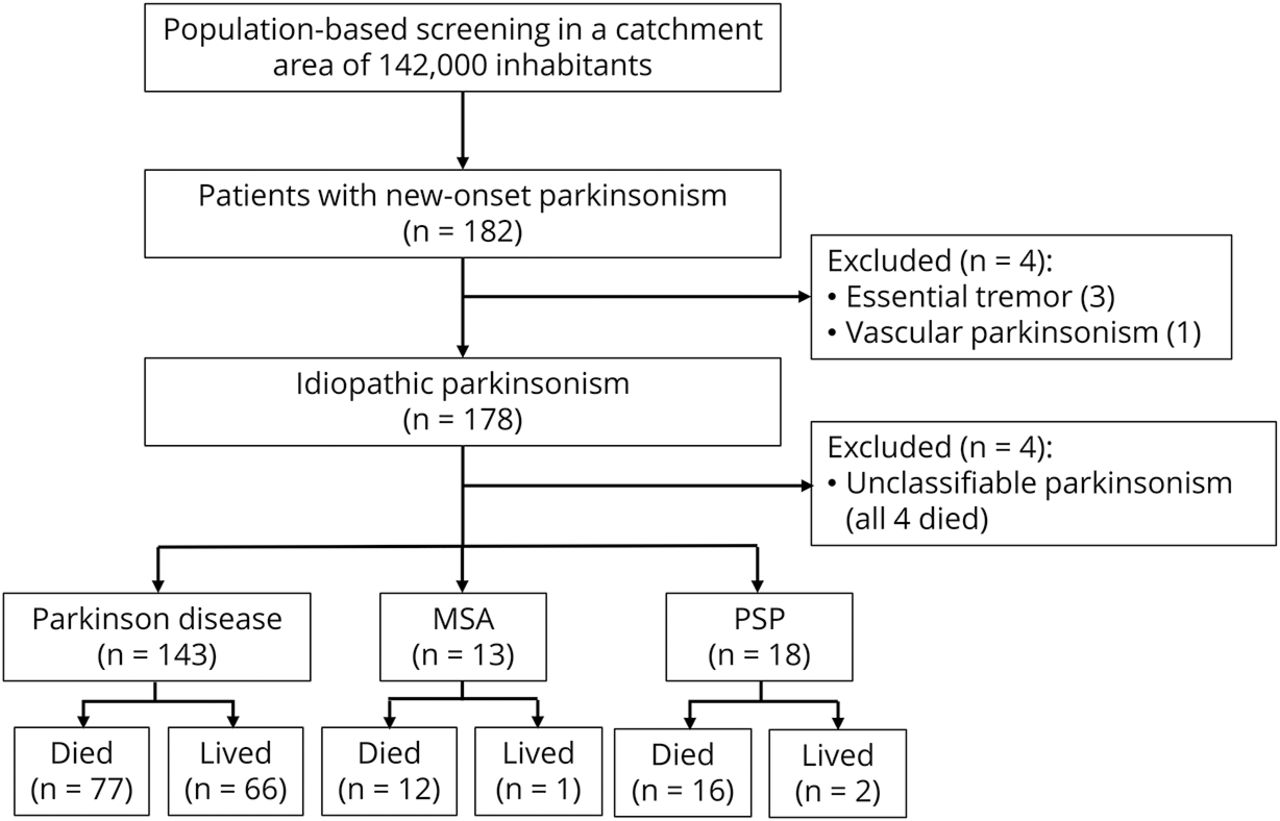 在最新的后续(死亡或8.5 - -13.5年之后包含在活着的病人),143名患者被诊断出患有帕金森病,与MSA 13, 18 PSP, 4为不可归类的帕金森症,4没有特发性震颤麻痹(图1)。尸检证实诊断3例PD和PSP的2例。