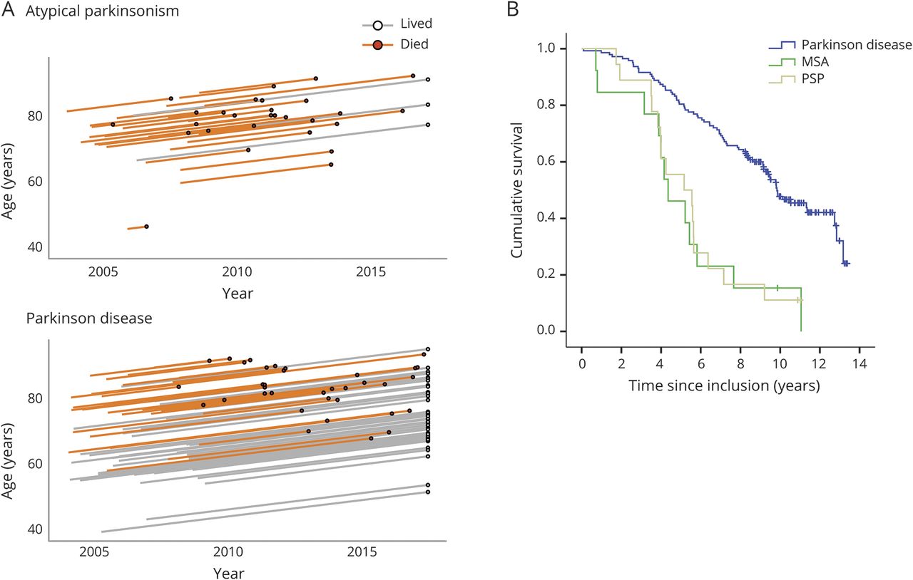 (一)词汇图显示病人的随访研究。“非典型帕金森症”集团包括最近诊断为MSA患者和PSP。(B) kaplan meier情节的生存与诊断(风险数量,请参阅补充表格e 1,links.lww.com/WNL/A762)。MSA =多系统萎缩;PSP =进行性核上的麻痹。