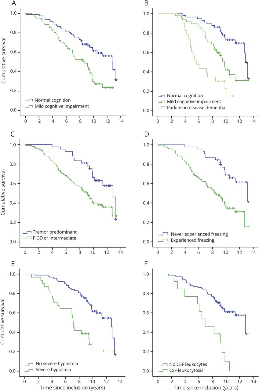 kaplan meier块生存患者的帕金森病(n = 143)的临床和神经生物学表型在基线(除了面板B,这是相关的表型在3年)。严重的嗅觉减退由B-SIT定义< 4分。所有的变量(f)的生存有着显著的相关性p< 0.001级(日志等级)除了地震或PIGD /中间变量(C),这是重要的p= 0.004级(依照风险数量,请参阅补充表,links.lww.com/WNL/A762)。B-SIT =短暂的气味鉴别试验;PIGD =心态的失衡和步态障碍。