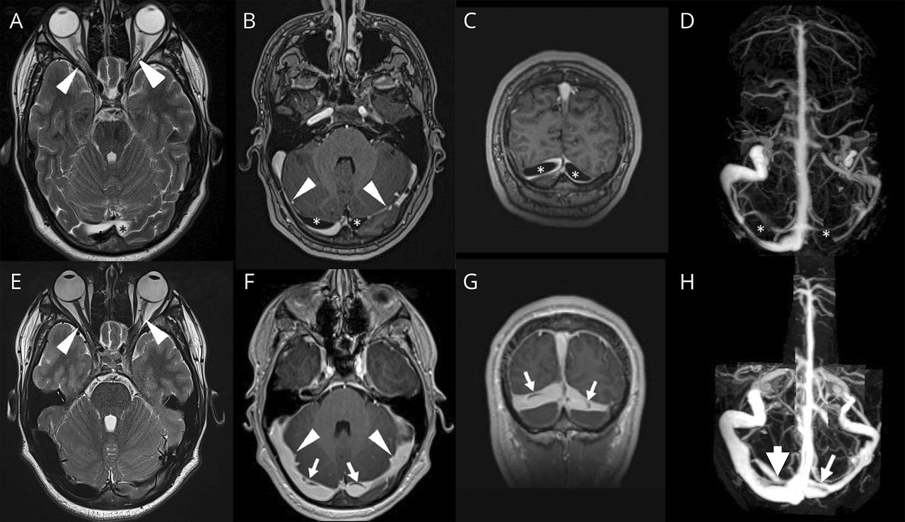 轴向t2加权图像显示视神经曲折(箭头)。轴向(B)和额叶(C) postcontrast t1加权成像和磁共振造影术(D)揭示巨大蛛网膜颗粒(GAG)(星号)和窦腔狭窄(箭头,B)。五天后腰椎穿刺,视神经曲折(箭头,E),呕吐(箭头,F-H)和窦腔狭窄(箭头,F)消失。