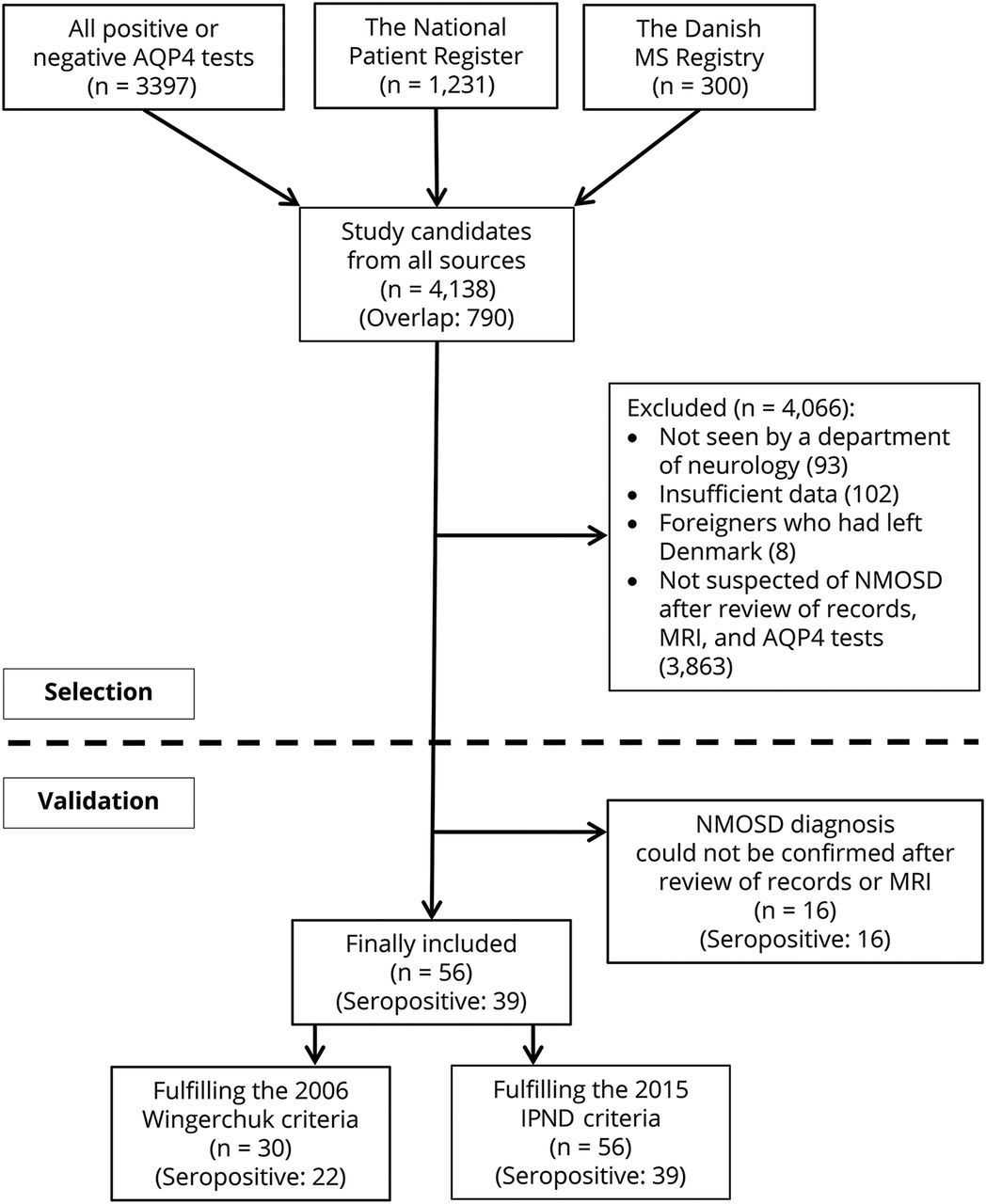 流程图展示了病人的策略选择和验证在丹麦16岁及以上的人口。AQP4 = aquaporin-4;IPND =国际视Neuromyelitis诊断面板;女士=多发性硬化症;视NMOSD = neuromyelitis谱系障碍。