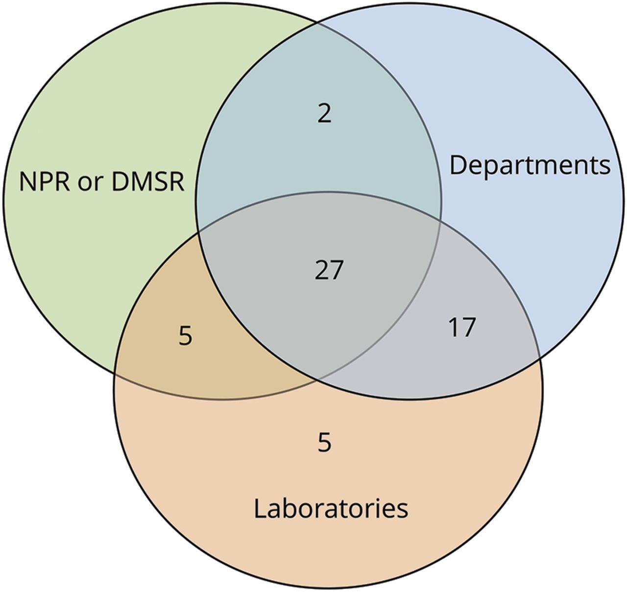 维恩图解表明,我们能够识别所有情况下的部门和实验室。NPR(国家病人注册表)和DMSR丹麦多发性硬化症(注册表)不具有独特的贡献情况。再分析要求通知通知的第二个来源是独立的第一来源。因为DMSR和NPR也强烈相互依赖和依赖的部门,我们把他们作为一个单一的来源。