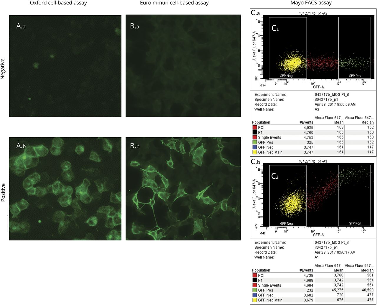 牛津细胞法(CBA) (A.a)阴性和(A.b)阳性;euroimmune CBA (B.a)阴性和(B.b)阳性;Mayo荧光活化细胞分选试验(FACS) (C.a)阴性和(C.b)阳性结果。对于Mayo FACS检测,使用2个细胞群来获得中位荧光强度。绿色荧光蛋白(GFP)阴性群体代表未转染的细胞,绿色荧光蛋白阳性群体代表同时表达乙酰化GFP和髓鞘少突胶质细胞糖蛋白(MOG)蛋白的细胞。AlexaFluor-647的中位强度是结合的人血清抗体的指标。如图(C.b)所示,阳性对照中,gfp阳性人群的AlexaFluor-647强度中位数为40,593,gfp阴性人群为477。阴性对照(C.a) gfp阳性种群的中位强度为162,gfp阴性种群的中位强度为147。这些统计值用于计算免疫球蛋白G (IgG)结合指数,该指数是gfp阳性值与gfp阴性值的比值。