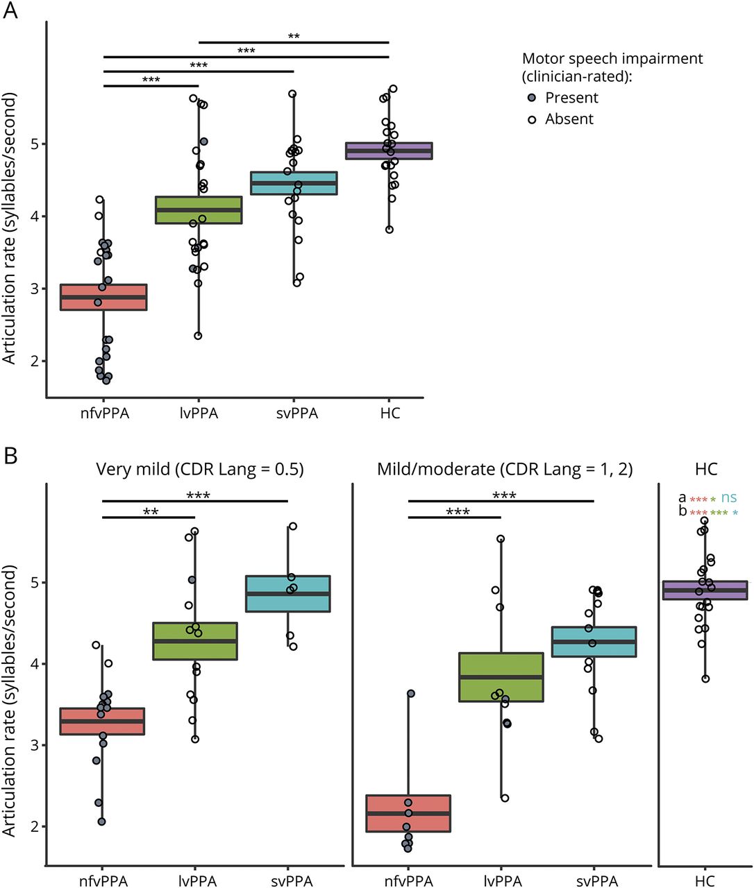(一)清晰度率(AR)在基线显著降低迟滞型变体原发性进行性失语患者(nfvPPA)与健康对照组相比(高碳钢)和所有其他原发性进行性失语患者(PPA)亚型。基于“增大化现实”技术也减少了患者logopenic变体PPA (lvPPA)而高碳钢。患者的严重性级别都包括在这个分析中。(B)患者中轻度疾病的严重程度,基于“增大化现实”技术在基线显著降低nfvPPA集团与其他PPA亚型。基于“增大化现实”技术更显著降低轻/中度患者的严重性。一个重大群体间的高碳钢和PPA子组之间的区别非常温和的严重性子群。颜色编码表示的意义为特定群体间的比较(粉红色显示HC vs nfvPPA,绿色显示HC vs lvPPA,蒂尔显示HC和语义变体PPA [svPPA])。b重要的高碳钢群体间的区别和PPA轻/中度严重子群的子组。颜色编码表示的意义为特定群体间的比较。粗线显示的意思;框显示扫描电镜。CDR =临床痴呆评定;ns =无意义的。* *p< 0.01,* * *p< 0.001。