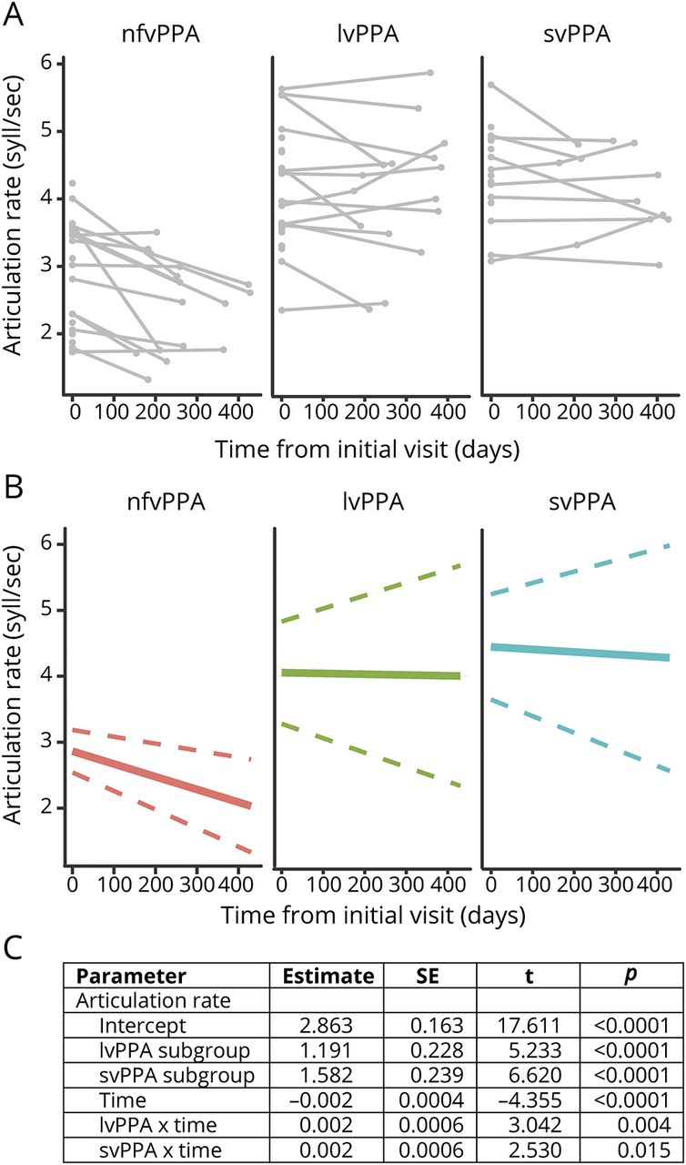 纵向数据的一个子集(n = 39)的原发性进行性失语患者(PPA)显示清晰度更快速下降率(AR)迟滞型变体PPA患者(nfvPPA)相比logopenic变体PPA (lvPPA)和语义变体PPA (svPPA)。各个数据点在基线和(A)(当可用)后续访问由子群。连接行显示个人的趋势。(B)组AR趋势作为时间的函数基于线性mixed-effects (LME)模型输出。实线显示意味着组斜率;虚线显示意味着集团的95%置信区间的斜率。(C) LME结果证明重要的子群的主要影响,时间,和时间×小组互动。SE =标准误差。