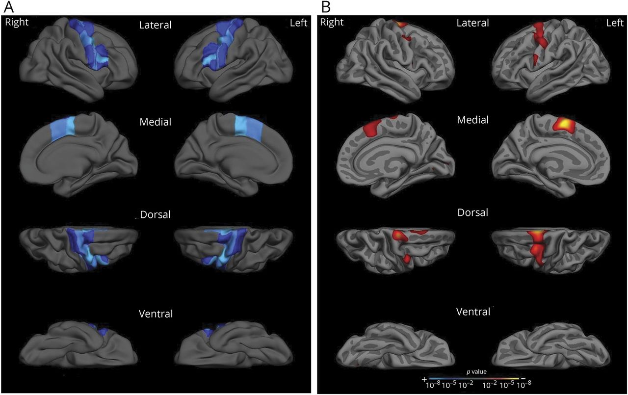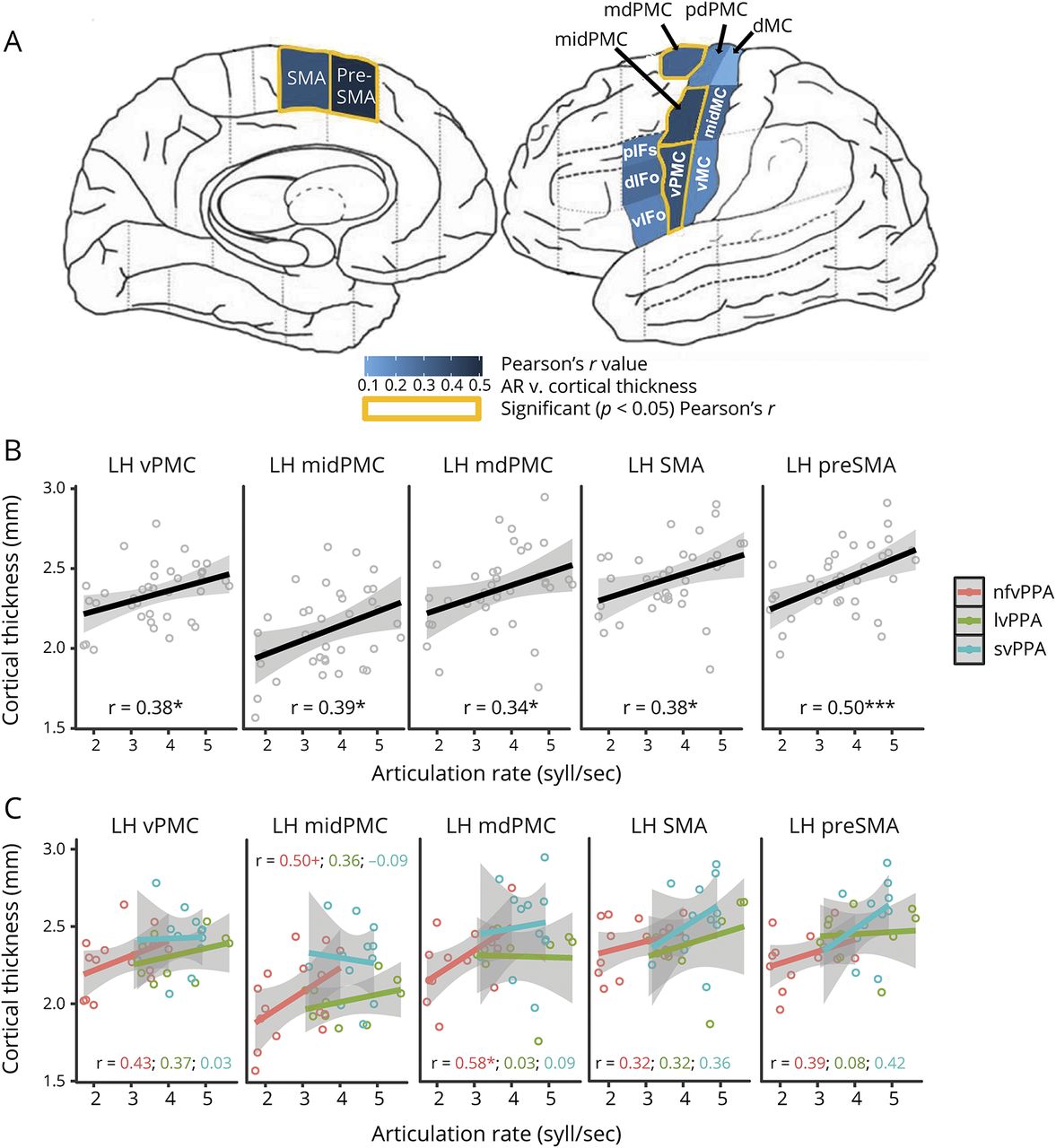测试的特异性萎缩和清晰度降低率之间的关系,事后整个皮质分析。我们使用一个广义线性模型(GLM)中实现FreeSurfer模型清晰度率和皮质厚度之间的关系在每一个顶点的皮质表面。清晰度率建模感兴趣的变量作为自变量,以皮质厚度为因变量在整个PPA队列。因为我们的主要假设是单向(即。,reduced articulation rate is associated with cortical thinning in motor speech ROIs), a 1-tailed GLM was performed. Given the small sample size and specific a priori hypotheses, a 1-tailed statistical threshold ofp< 0.01,未修正的,是用于分析。我们使用这个相对自由的阈值的考虑,如果演讲电动机控制地区的影响被发现符合我们ROI分析而不是其他皮质,这将提供强有力的支持作用的特异性。结果展现在一个独立的,大脑模板表面平滑的宽屏/半峰值15。