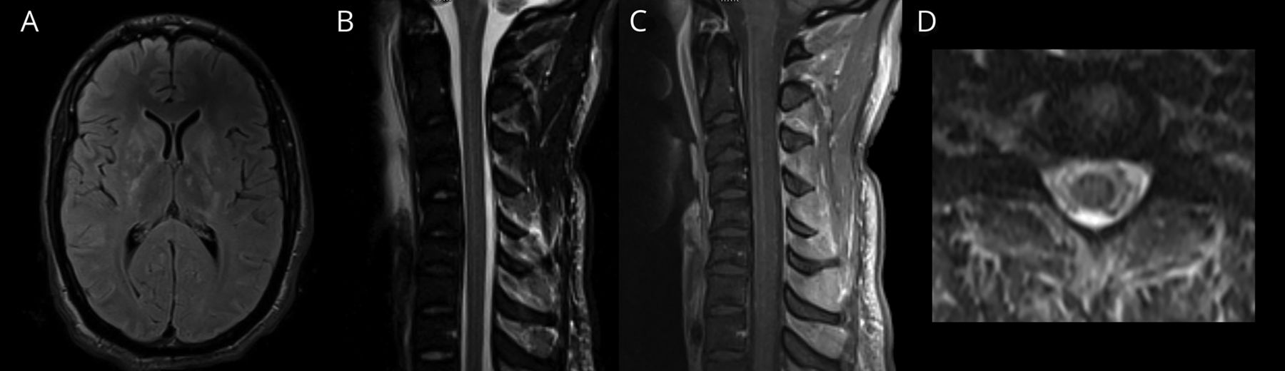 (一)Fluid-attenuated反转恢复轴向基底神经节的形象;(B) t2加权MRI矢状颈椎的系列;(C)与钆对比相应的t1加权MRI矢状;和(D)对应的轴向t2加权磁共振成像。