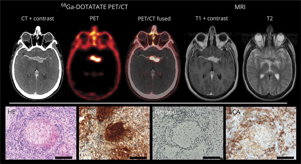 MRI:充当在海绵窦病变病灶周边水肿和接触交叉和血管。68年Ga-DOTATATE PET / CT:高68年Ga-DOTATATE吸收。苏木精和伊红染色:noncaseating上皮样肉芽肿。CD68染色:紧密epitheloid巨噬细胞。Gomori染色:初期perigranulomatous纤维化包围白细胞共同抗原(LCA)阳性淋巴细胞(放大×20、酒吧100μm)。