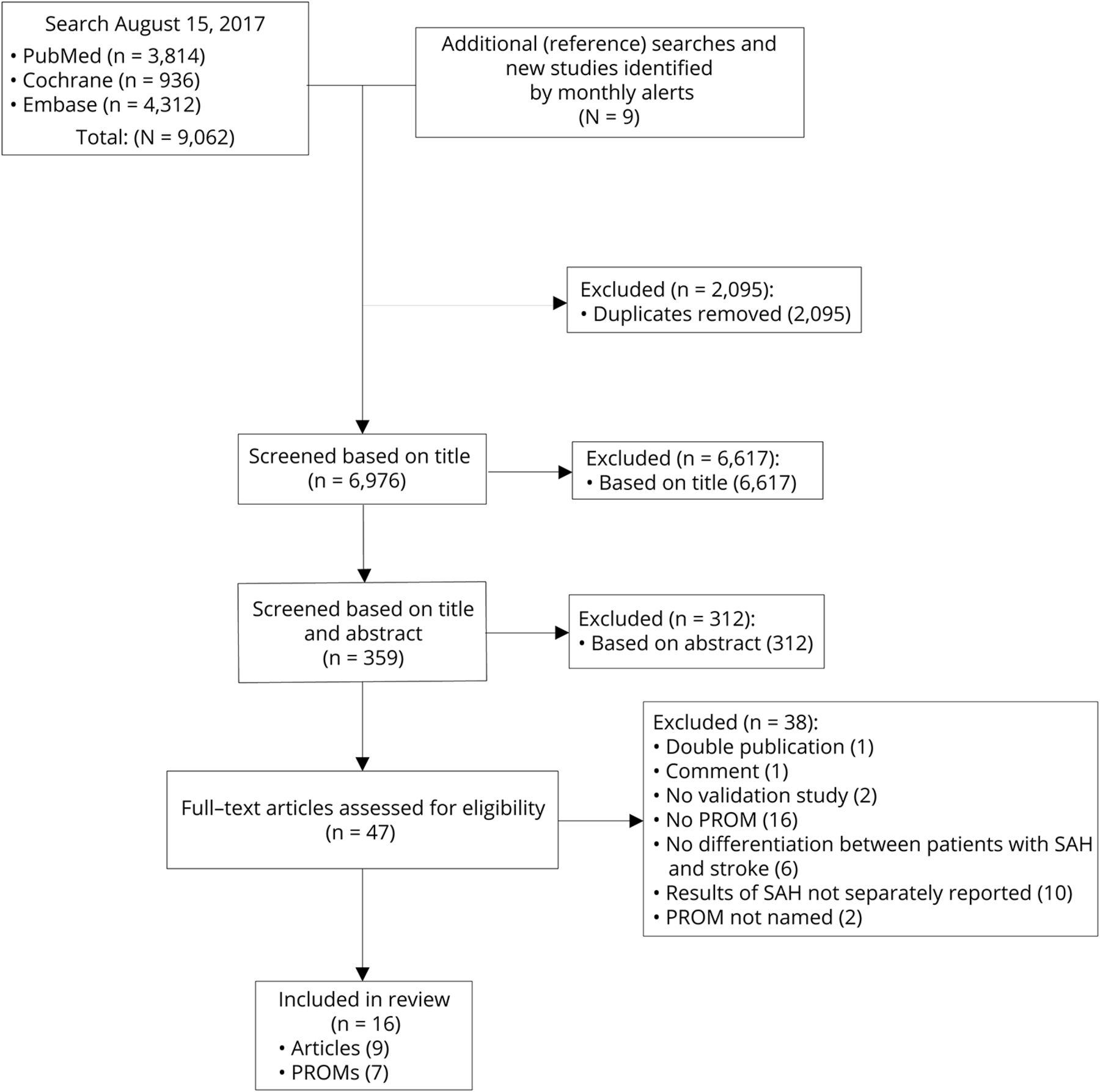 我们的系统审查确定了数量有限的可用的验证研究。在某种程度上这是由于我们使用的包含和排除标准。排斥的最重要的原因是,结果患者aSAH表示没有分开描述的其他血管疾病患者。aSAH表示是一个不同的实体从缺血性中风,出血性中风,或颅内动脉瘤。aSAH表示通常比病人年轻患者体验其他类型的中风,导致症状的高干扰他们的社会参与和社会角色。35尽管如此,这些血管疾病常常结合在舞会和验证研究结论为整个集团。我们明确地选择承认不同的疾病实体和只关注aSAH表示患者。我们的搜索发现了6976独特的优点和aSAH表示文章,其中只有9篇文章包含在最终的审查。巨大的选择过程中减少合格的研究引起了广泛的条款我们曾经覆盖所有相关的舞会,因为没有指定列表的舞会。