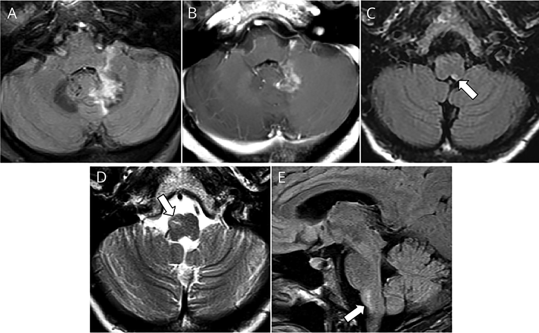 轴向图像显示T2 hyperintensity左齿状(A),以增强postgadolinium (B),和区域postrema T2 hyperintensity (C),重复MRI显示正确的下橄榄核T2 hyperintensity /肥大轴向(D)和矢状图像(E)。