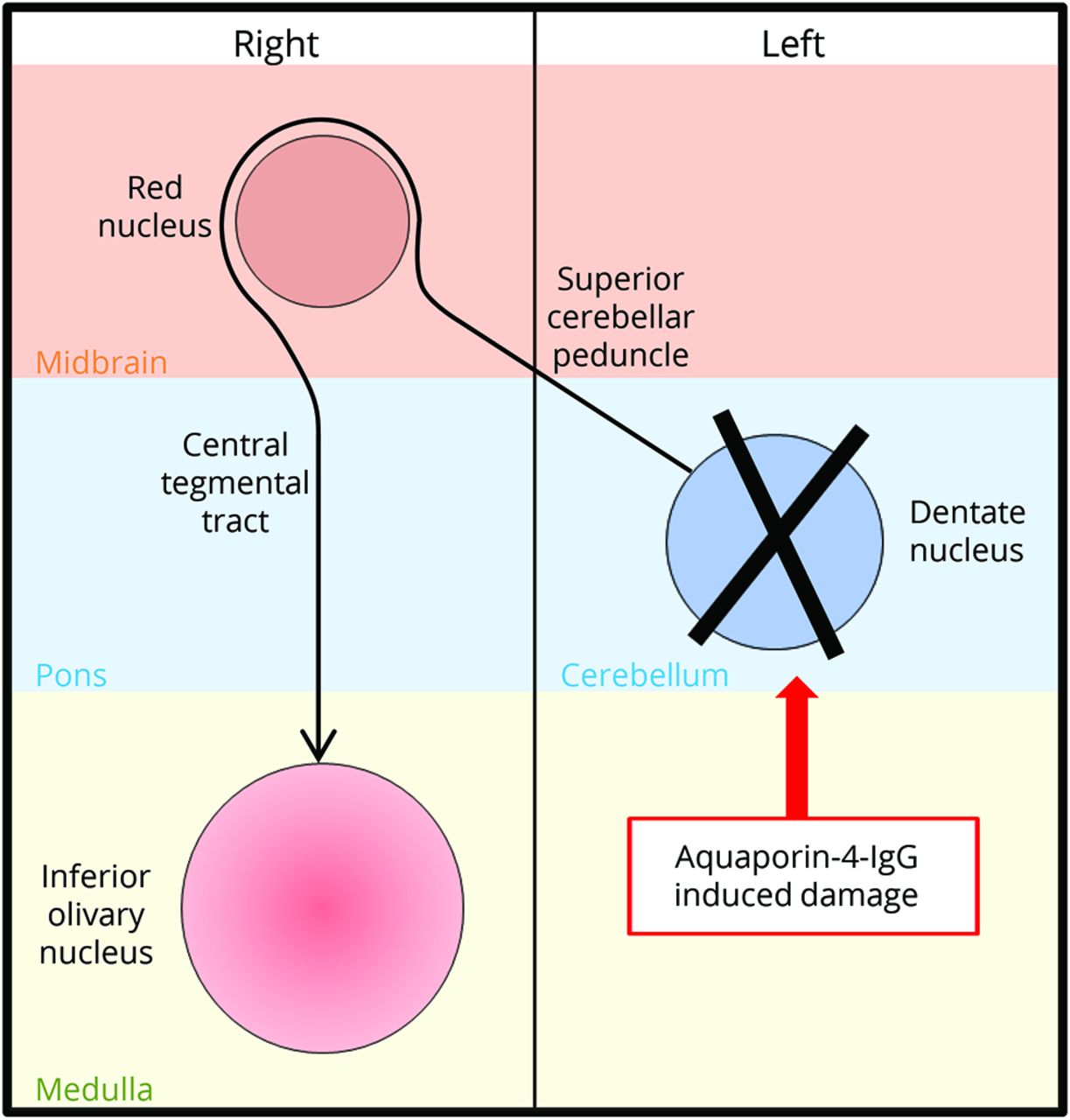 一位51岁的女人发达亚急性共济失调和棘手的呕吐。MRI显示左齿状和面积postrema病变(图1中,得了)。血清aquaporin-4-immunoglobulin G积极确认视neuromyelitis谱系障碍。血浆置换联合治疗类固醇和敏锐和维护6个月利妥昔单抗。9个月后MRI显示一个新的无症状右髓病变(图1中,D和E),促使霉酚酸添加治疗。肥大,预期位置和时间进程使我们诊断肥厚性从dentato-rubro-olivary电路(Mollaret三角形卵形的退化图2])中断;没有腭地震发生。1,2霉酚酸是停止。未能识别髓病变为肥厚性从之前侮辱沿着Mollaret三角形卵形的退化可能会导致不必要的治疗。