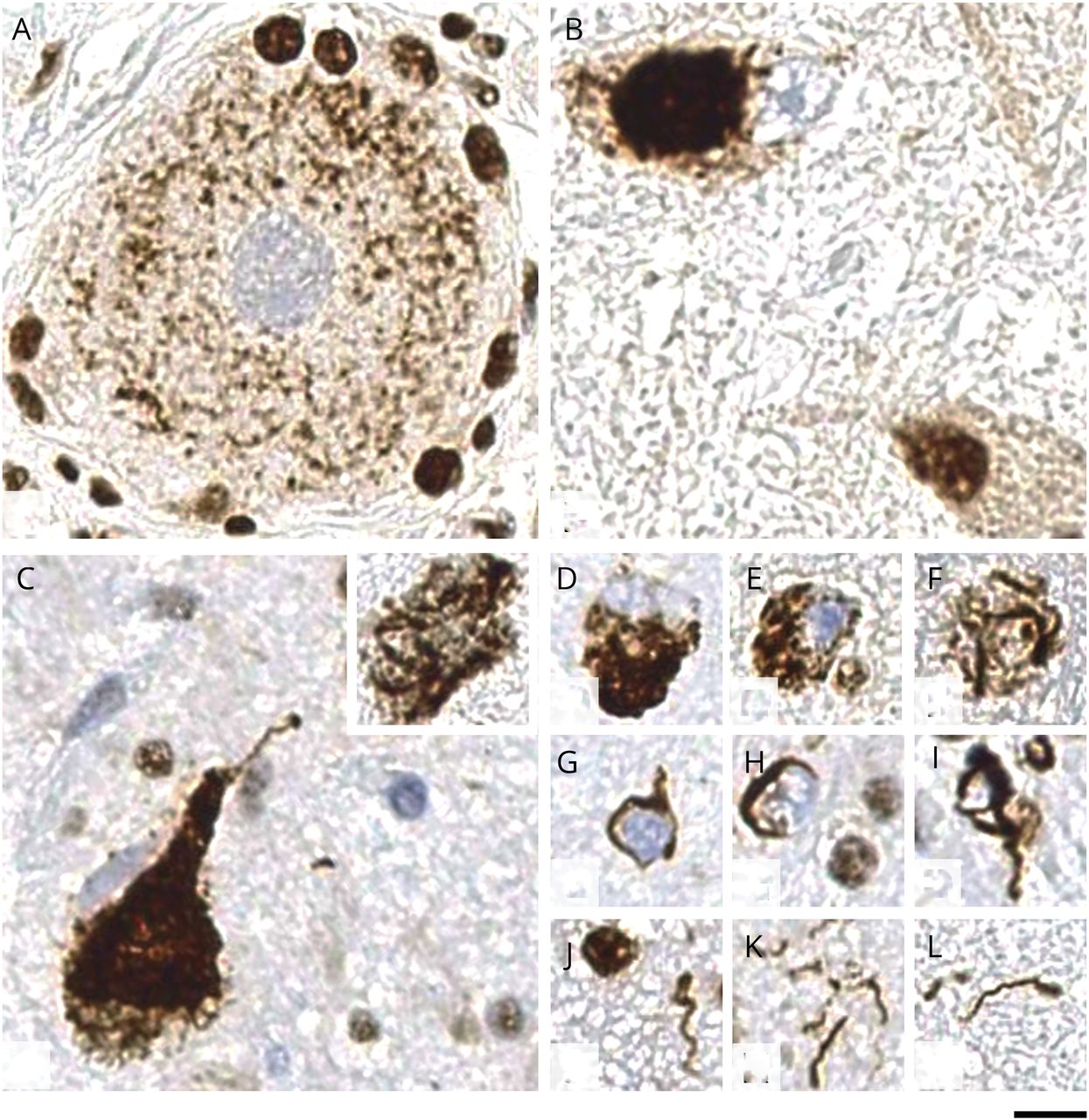 (一)病理形如存款在背根神经节神经元。(B)球状细胞质内含物在腰椎前角运动神经元。(C)大球状和skein-like(嵌入)在着色的黑质神经元胞质内含物。(D-F)神经元胞质内含物的不同形态。(G - I)胶质细胞质内含物,所有的显示相似,蛇的身体,就像形态。(J-L)神经突瘠薄的表象,都是短而弯曲,没有长探明的证据。所有部分都应用nonphosphorylated焦油dna结合蛋白43 (TDP43)抗体,检测正常核TDP43标签和显示不存在核标记细胞中哪里有TDP43定位错觉从细胞质或核细胞过程。l规模酒吧:10μm面板。FOSMN = facial-onset感觉和运动neuronopathy。
