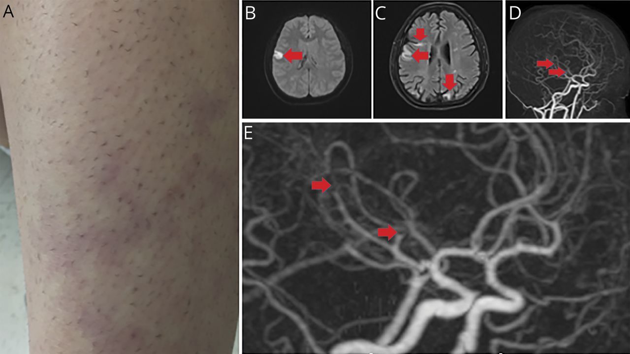 (A)皮肤检查显示腿部网样紫色红斑斑块,与总状肝相符(手臂和躯干未显示)。(B)脑MRI示右额叶弥散受限(箭头),相应的表观弥散系数信号降低,与急性缺血性卒中相符(图中未示)。(C)液体衰减反转恢复序列显示,双脑半球深部白质和皮质-皮质下区域有大量慢性缺血性病变(箭头)。(D、E)脑CT血管造影显示左右大脑中动脉皮层分支多处不规则,主要分布在M2、M3水平(箭头)。类似的不规则沿右大脑后动脉(未显示)。