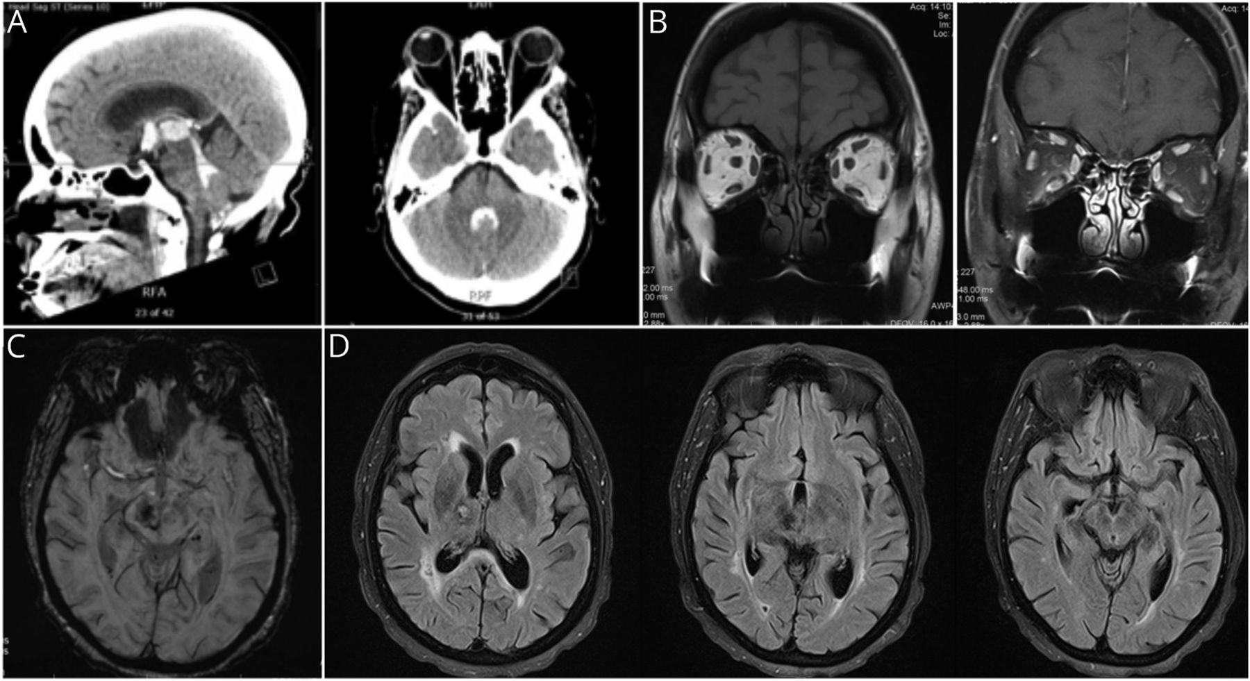 (一)矢状轴向(右)(左)和CT图像显示急性脑室,intrathalamic和中脑的出血。(B) MRI冠状切片显示正常的轨道(左:t1,右:t1脂肪饱和postcontrast)。(C) Susceptibility-weighted轴切片显示含铁血黄素沉积和(D) t2加权fluid-attenuated反转恢复图像显示体积丧失正确的丘脑和中脑个月后严重的侮辱。
