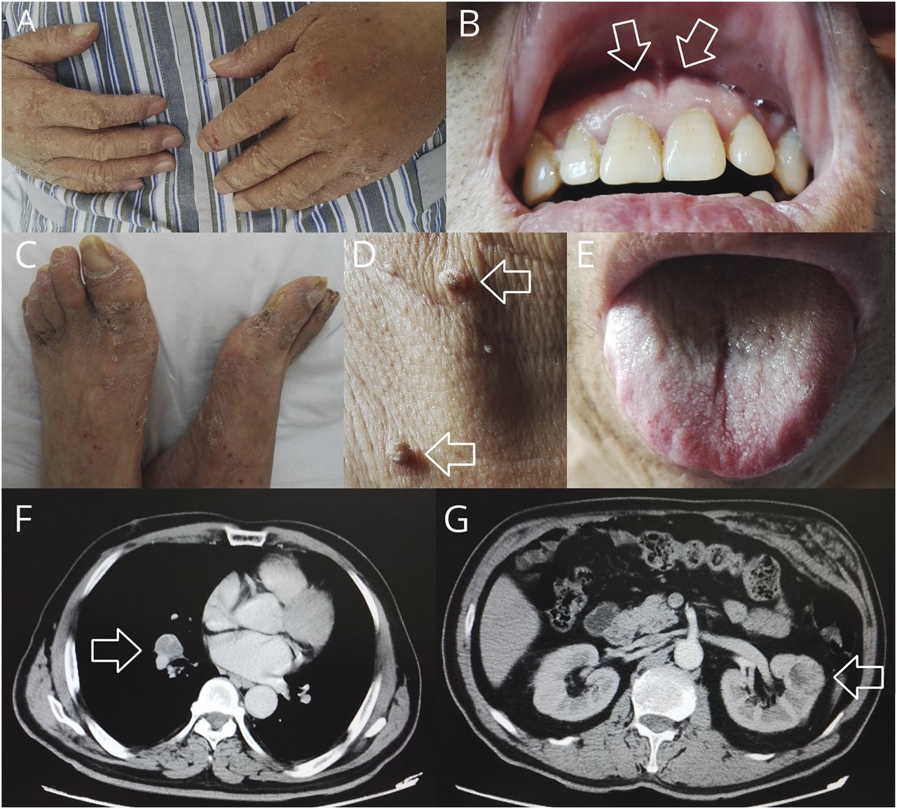 Acrokeratosis的手指和脚趾(A、C),黏膜与皮肤的齿龈和颈部周围的乳头瘤样增生(B, D),和裂缝性舌(E)构成了特定的皮肤变化。增强CT显示,肺和肾脏恶性肿瘤(F, G)。