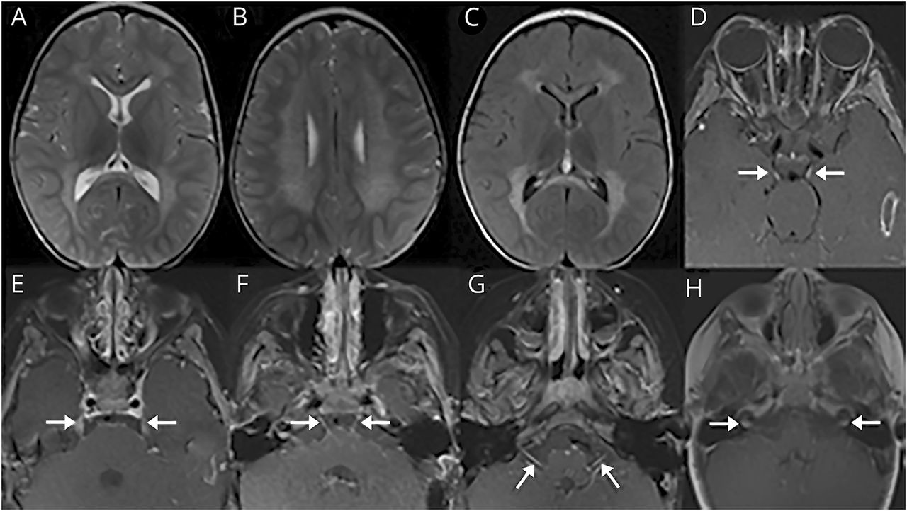 轴向T2 (A, B)和fluid-attenuated反转恢复(C)图像显示对称支流hyperintensities leopard-like外观在室周的白质,中枢semiovale(爱惜皮层下U纤维)、膝、胼胝体压部。轴向超声造影T1图像显示对称增强两国第三颅神经(D,箭头),双边第五颅神经(E,箭头),双边第六颅神经(F,箭头),双边第七颅神经(G,箭头)和双边第八颅神经(H,箭头)。
