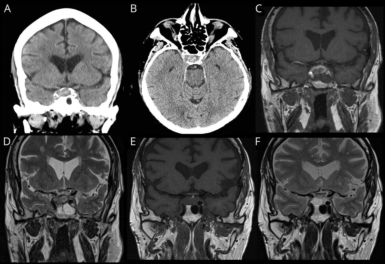 (一)冠状和(B)轴向CT显示sellar发现可疑病变。(C)冠状T1加权磁共振成像大脑sellar视图显示外围T1 hyperintensity笨重的脑下垂体,测量前后的1.7厘米由纵1.3厘米,2.1厘米中间外侧的横向延伸到上级的正确的海绵窦和对接上级和右颈内动脉的内侧方面。在日冕t2加权MRI (D)相应的视图。(E)冠状T1和T2 (F)冠状视图sellar内容的四个月随访MRI显示慢性血液制品除了垂体薄壁组织或肿瘤,现在测量1.3×2.0×1.1厘米。