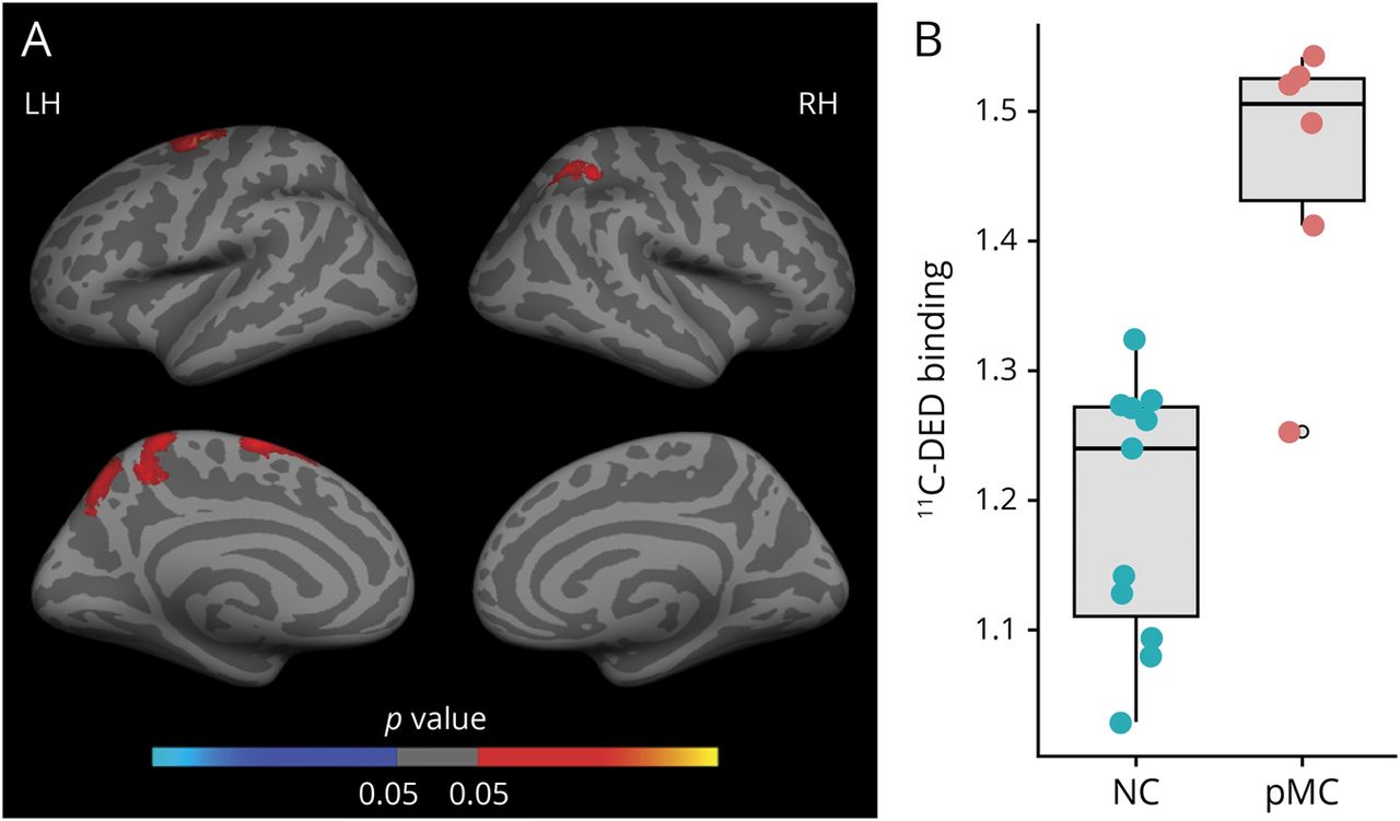 (A)表面地图代表的增加(黄)11c - d宠物绑定pMC相比,数控;仅存的集群多重比较校正进行描述(family-wise错误(FWE)—p< 0.05);所有重要的集群中可用的坐标表依照(doi.org/10.5061/dryad.585581j)。(B) Box-and-whisker情节比较平均11c - d绑定在左半球(LH)之间的pMC(红色)和数控(蓝色)(便于说明)。RH =右半球。