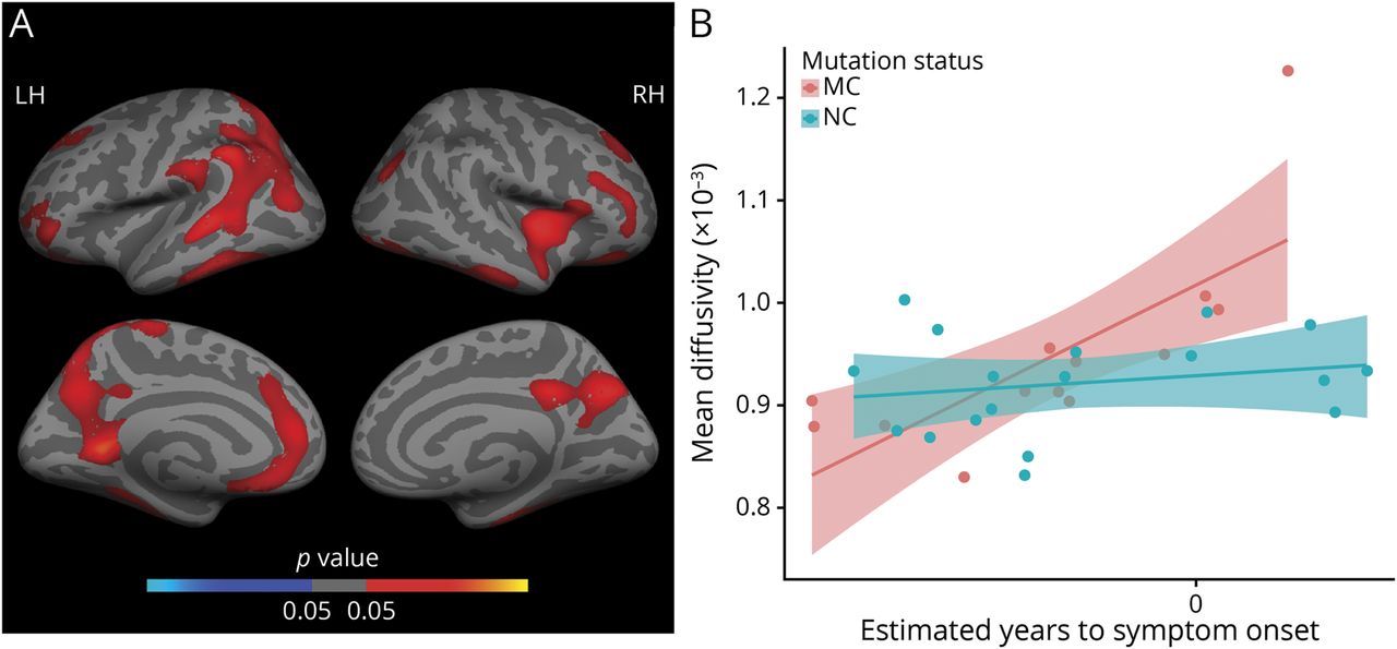 在症状性载体,观察增加皮质MD符合我们之前的症状阶段学习零星的广告。15在此阶段,组织的完整性和故障损失细胞膜和细胞内细胞器会导致水分子更容易移动,从而增加扩散系数。40