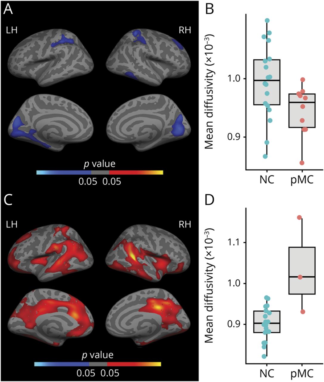 (A)表面地图代表集群的减少(蓝色)皮质MD pMC相比,数控;仅存的集群多重比较校正进行描述(family-wise错误(FWE)—p< 0.05);所有重要的坐标表e-5集群可用(doi.org/10.5061/dryad.585581j)。(B) Box-and-whisker情节比较之间的平均左半球内皮层MD pMC(红色)和数控(蓝色)(便于说明)。(C)表面地图代表的增加(用红色)皮质MD sMC相比,数控;仅存的集群多重比较校正进行描述(FWE-correctedp< 0.05);所有重要的坐标表e-5集群是可用的。(D) Box-and-whisker情节比较左半球内的平均MD (LH) sMC(红色)和数控(蓝色)(便于说明)。RH =右半球。