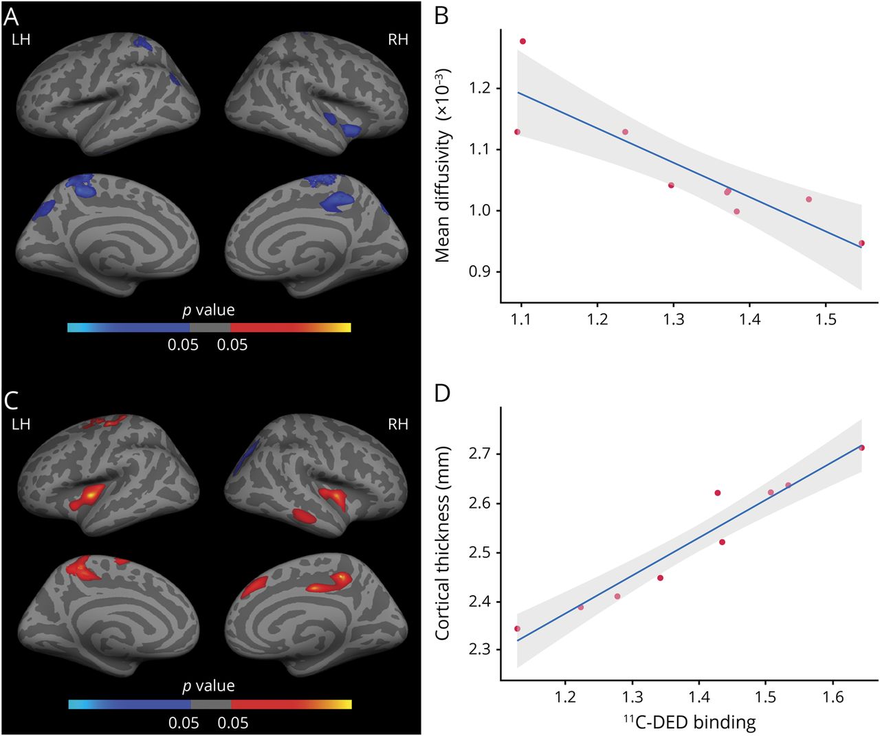 (A)表面地图表示的重要vertex-wise astrocytosis之间的负相关性(蓝色)来衡量11c - d宠物绑定和皮质的意思是扩散系数(MD)。仅存的集群多重比较校正进行描述(family-wise错误(FWE)—p< 0.05);所有重要的坐标表e-6集群可用(doi.org/10.5061/dryad.585581j)。(B)线性回归的皮质MD(垂直轴)vs11c - d宠物绑定(横轴)内的平均左半球(LH),包括在模型预测95%置信区间(便于说明)。(C)表面地图代表的重大vertex-wise astrocytosis以之间的相关性11c - d宠物绑定和皮质厚度(车车)。仅存的集群多重比较校正进行描述(FWE-correctedp< 0.05);所有重要的坐标表e-6集群是可用的。(D)线性回归的车车(垂直轴)vs11c - d宠物绑定在LH(横轴)评估,包括在模型预测95%置信区间(便于说明)。RH =右半球。