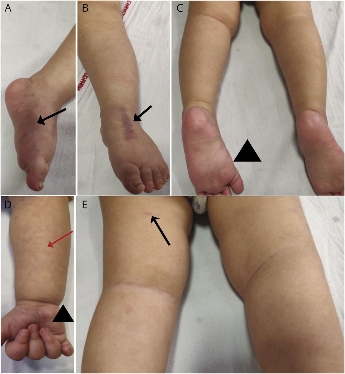 一个10个月大的女孩面对全球发展迟缓,bruisability癫痫痉挛,容易。她fourth-born逼供的血缘的父母有3个健康的兄弟姐妹。产期是平淡无奇。检查发现头小畸型,中央张力减退、手足发绀、斑点皮肤,在四肢瘀点(图1)。神经影像学发现奇特的发现(图2)。脑电图显示修改hypsarrhythmia (图3)。癫痫痉挛解决口服强的松治疗(在3毫克/公斤/天,2周之后,逐渐减少超过6周)。她高C4-acylcarnitines串联质谱(TMS)和尿ethylmalonic酸在尿气相色谱质谱(GCMS)。ethylmalonic脑病的诊断(EE)证实了基因(c。487 c > T;p。一个rg163Trp homozygous variation inETHE1)。她开始在n -乙酰半胱氨酸、甲硝哒唑和线粒体鸡尾酒,但死于急性危机在14个月大的时候。