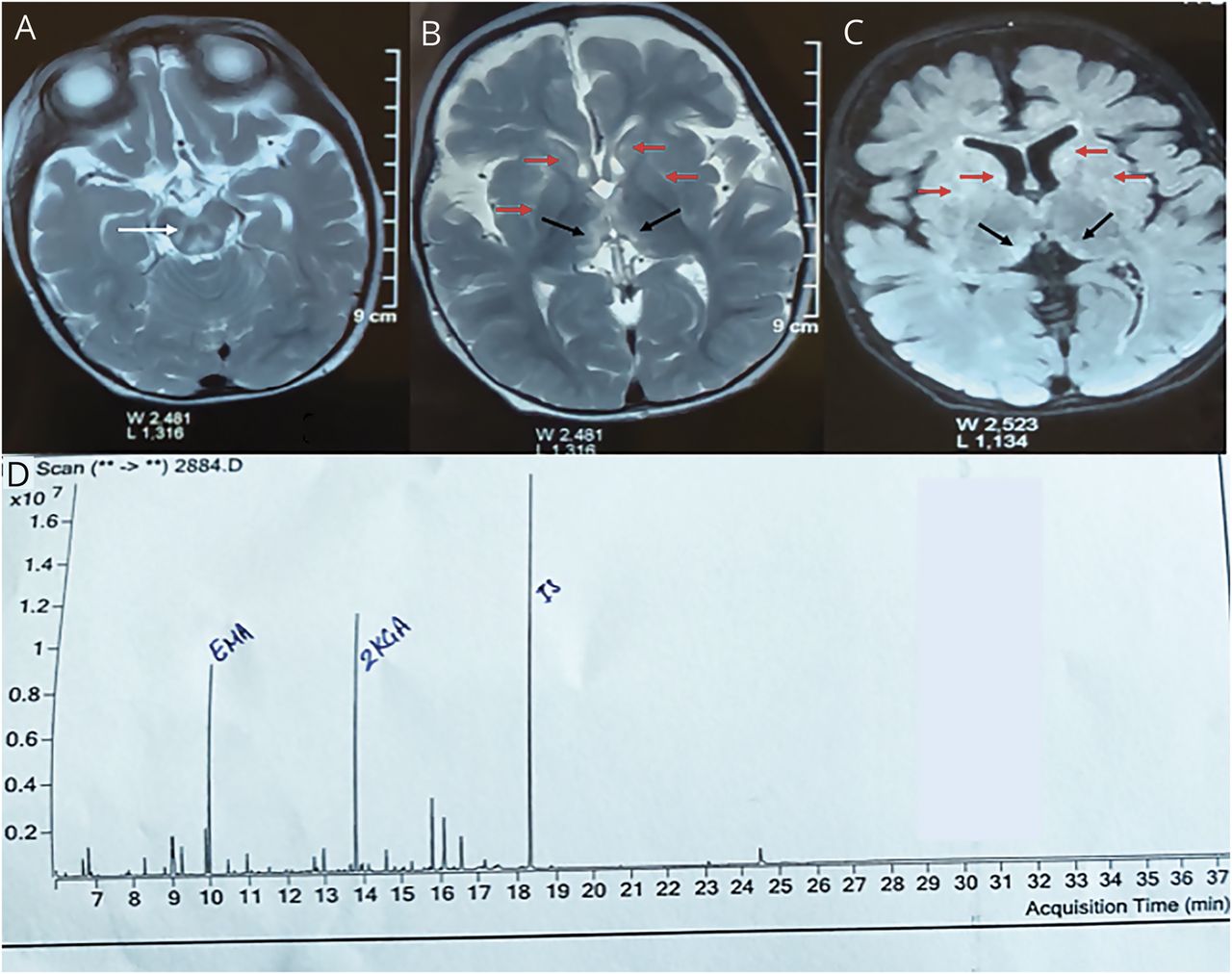 T2加权(A, B)和T2 fluid-attenuated反转恢复(C)轴向图像显示hyperintensities在中脑被盖;白色箭头),双边尾状核、壳核(红色箭头)和丘脑枕区(黑色箭头)。Total ion chromatogram (D) of urine metabolites by GCMS shows increased excretion of ethylmalonic acid (EMA), 2-ketoglutaric acid (2-KGA), isobutrylglycine, and isovalerylglycine.