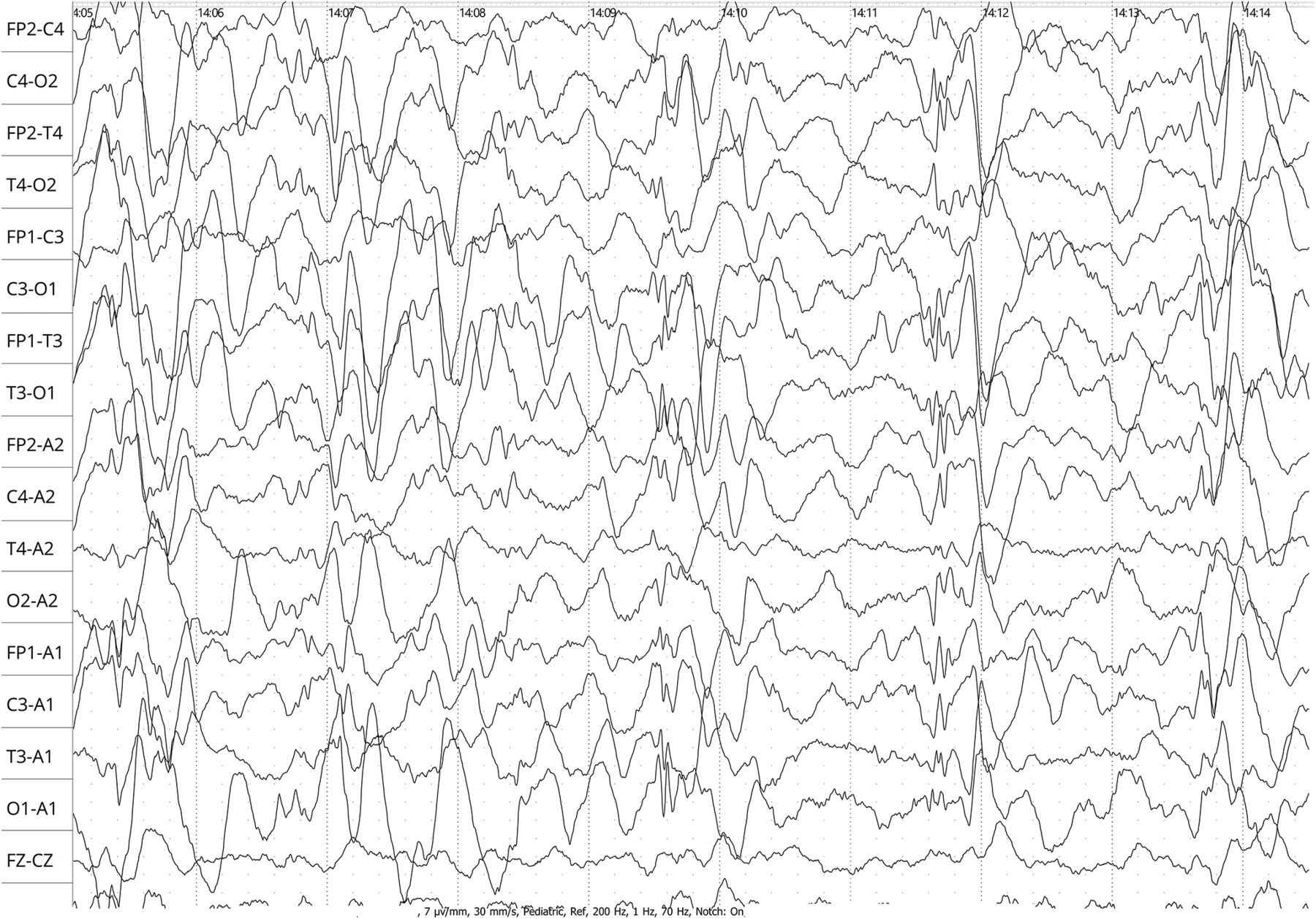 十秒脑电图时代(儿科蒙太奇;灵敏度70μV;扫描速度30 mm / s)显示的polyspike波放电其次是衰减和posterior-dominant高振幅慢波,这是符合hypsarrhythmia修改。