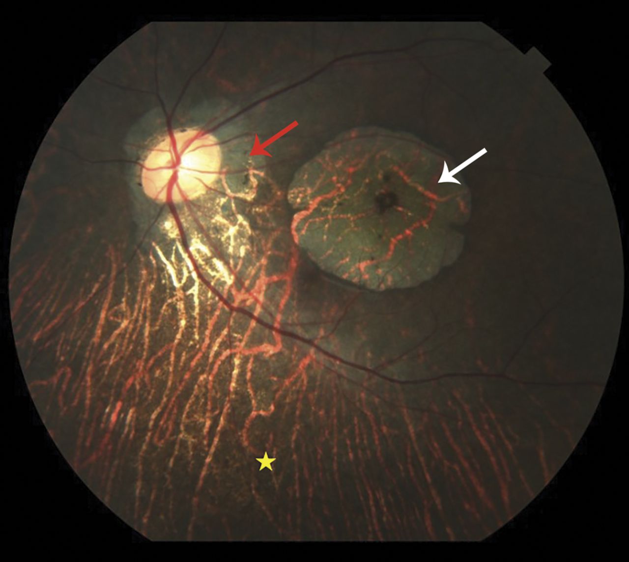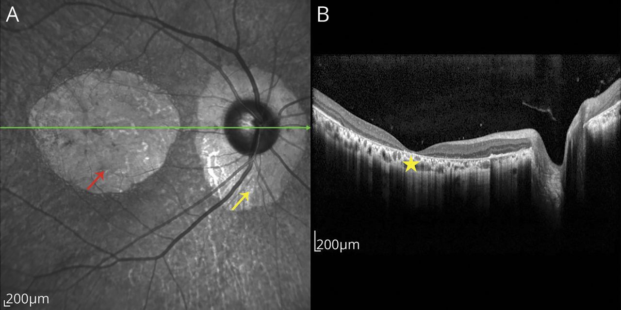(一)近红外光显示黄斑萎缩(红色箭头)和视神经盘旁脉络膜萎缩(黄色箭头)。(B)完成视网膜中央凹萎缩,失去深黄斑层在萎缩性地形,和损失的视神经盘旁视网膜色素上皮(明星)。