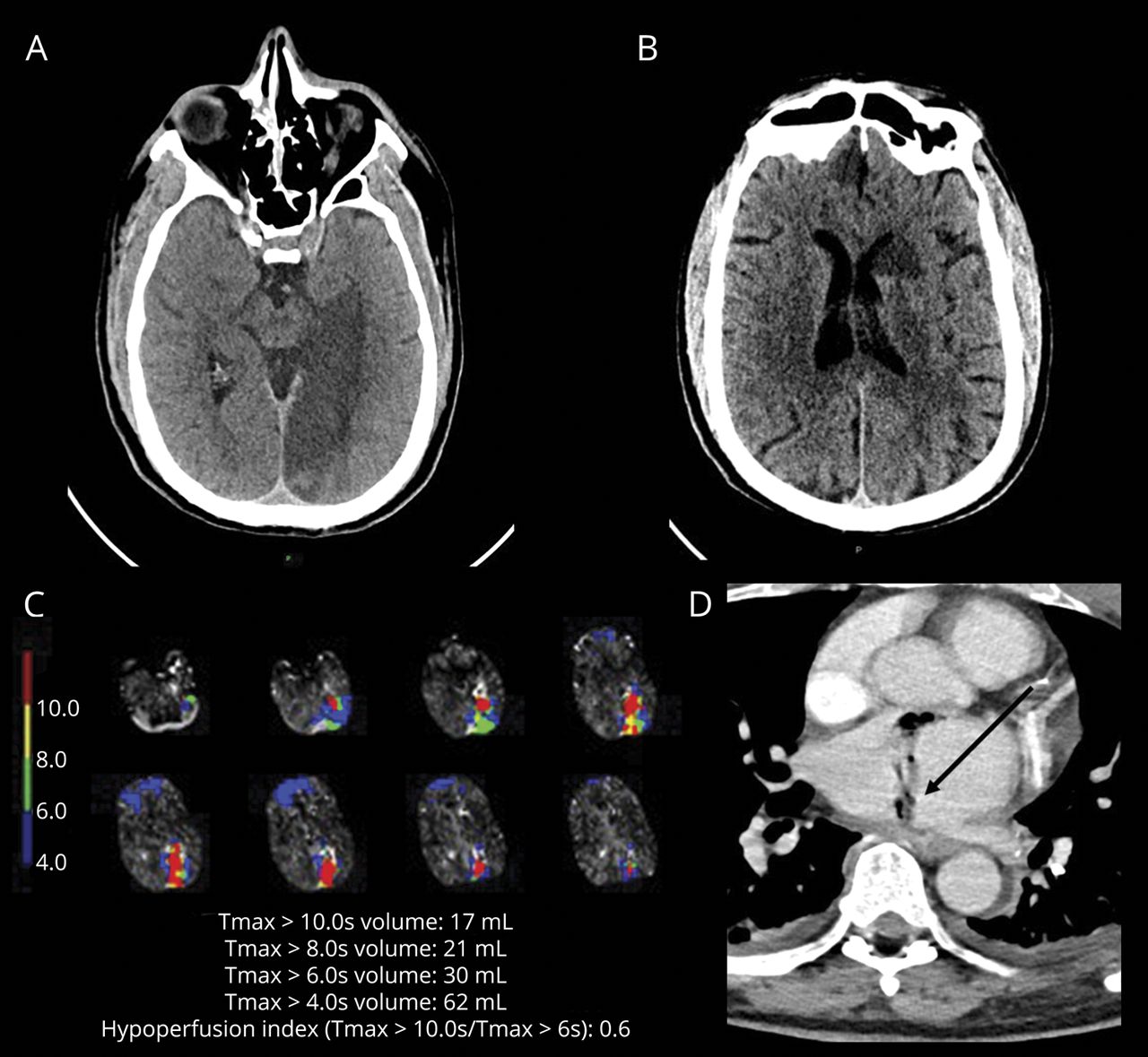 轴头CT显示多病灶的脑梗塞(A)左侧颞枕叶和(B)基底神经节,(C) CT灌注(快速、Ischemaview,红木,CA)显示在多个血管灌注不足地区,空气和(D)轴向胸部CT显示在左心房和左心室附属物(箭头所指)。