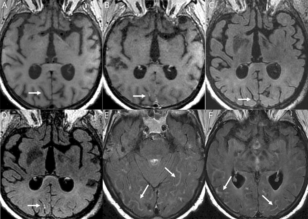 Axial T1 (A) before and (B) 5 minutes after contrast, axial FLAIR (C) before and (D) immediately after contrast, and (E and F) delayed (10 minutes) postcontrast axial fluid-attenuated inversion recovery (FLAIR) weighted MRIs. Woman 77 years of age: diffuse leptomeningeal linear FLAIR and T1 contrast enhancement (arrows) not visible on precontrast T1 and FLAIR (arrows) but seen better on delayed postcontrast FLAIR weighted MRIs (E and F).