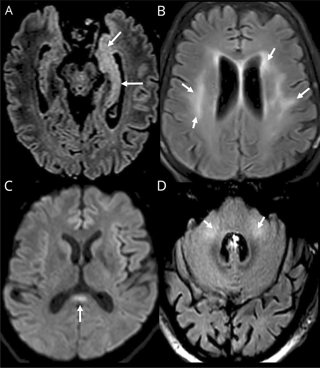 (A, B, D) Axial fluid-attenuated inversion recovery (FLAIR) and (C) diffusion-weighted MRIs. (A) Man 56 years of age: left hippocampus and amygdala FLAIR hyperintensity. (B) Woman 71 years of age: periventricular and subcortical white matter FLAIR confluent hyperintensities. (C) Man 55 years of age: corpus callosum splenium diffusion hyperintensity. (D) Man 64 years of age: FLAIR middle cerebellar peduncle hyperintensity.
