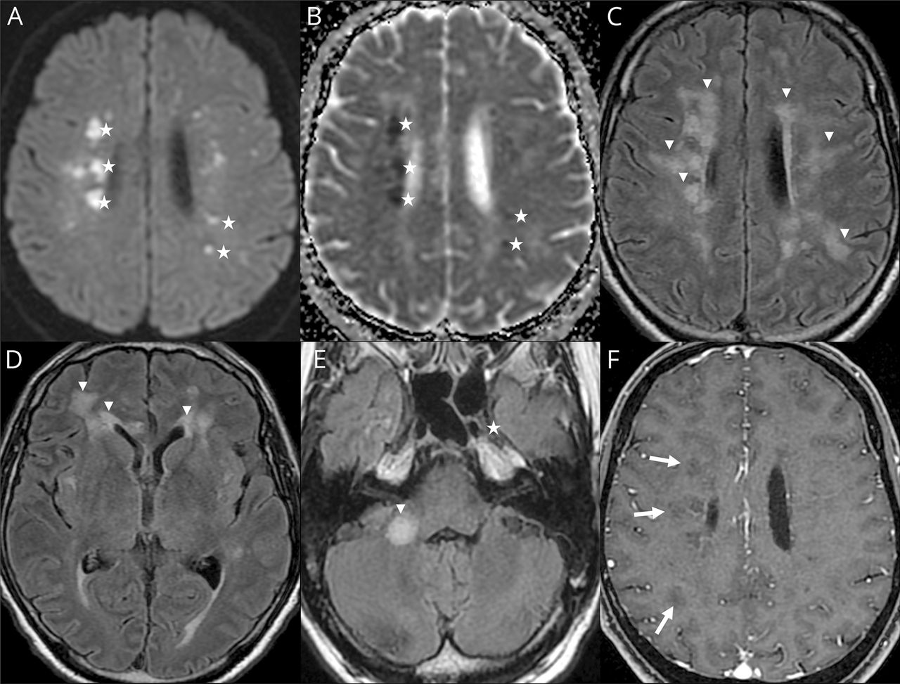 (A, E, I) Axial fluid-attenuated inversion recovery (FLAIR), (B, F, J) axial diffusion, (B, F, J) apparent diffusion coefficient (ADC) map, and (D, H, L) postcontrast T1-weighted MRIs. Man 60 years of age: subcortical, periventricular, corpus callosum, and posterior fossa white matter FLAIR hyperintensities without contrast enhancement (arrows). Some lesions appear hyperintense on diffusion-weighted MRIs, with decreased ADC corresponding to cytotoxic edema (stars). Other lesions present an ADC increase corresponding to vasogenic edema (cross).