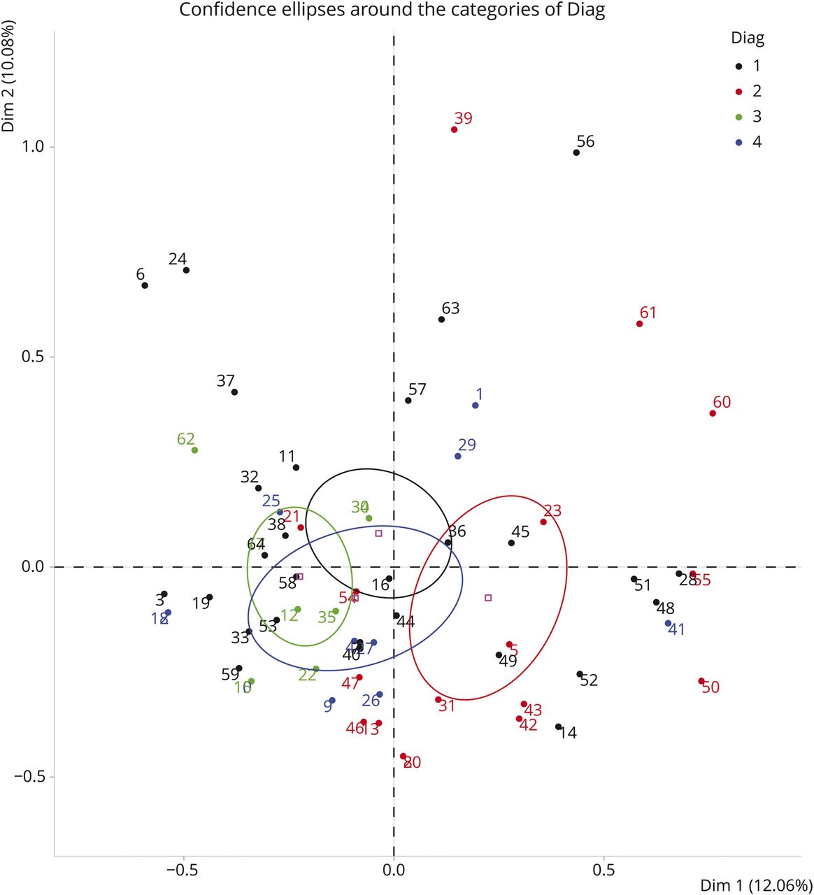 The ischemic stroke group (red) can be distinguished from the 3 others, which largely overlap. Most patients with ischemic stroke (numbers and dots in red on the plot) are located on the same lower-right half of the graph, indicating a commonality of symptoms. Diag 1 (black) = normal brain MRI; Diag 2 (red) = ischemic stroke; Diag 3 (green) = encephalitis; Diag 4 (blue) = leptomeningeal enhancement.